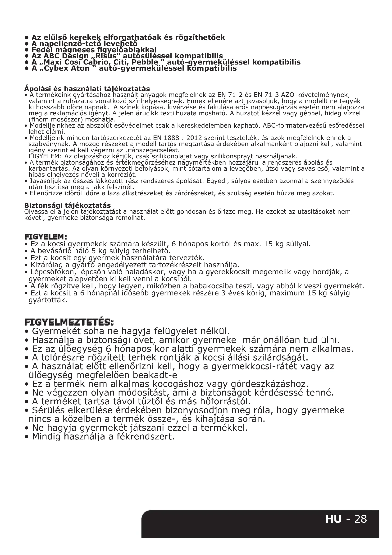 - Ezt a kocsit a 6 hónapnál idősebb gyermekek részére 3 éves korig, maximum 15 kg súlyig gyártották. FIGYELMEZTETÉS: