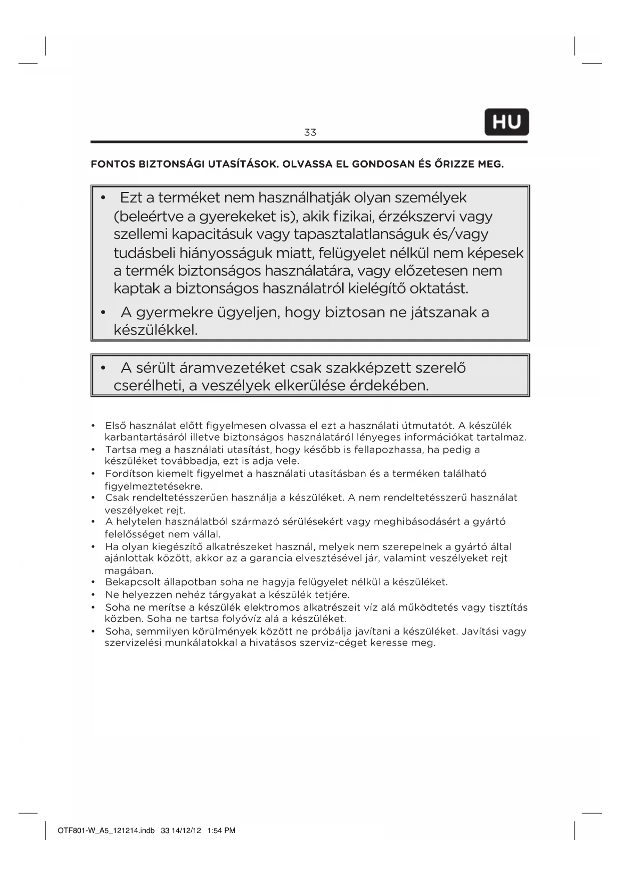 - Soha,semmilyenkörülményekközöttnepróbáljajavítaniakészüléket.Javításivagy szervizelésimunkálatokkalahivatásosszerviz-cégetkeressemeg. OTF801-W_A5_121214.indb 33 14/12/12 1:54 PM34 Size - A5
