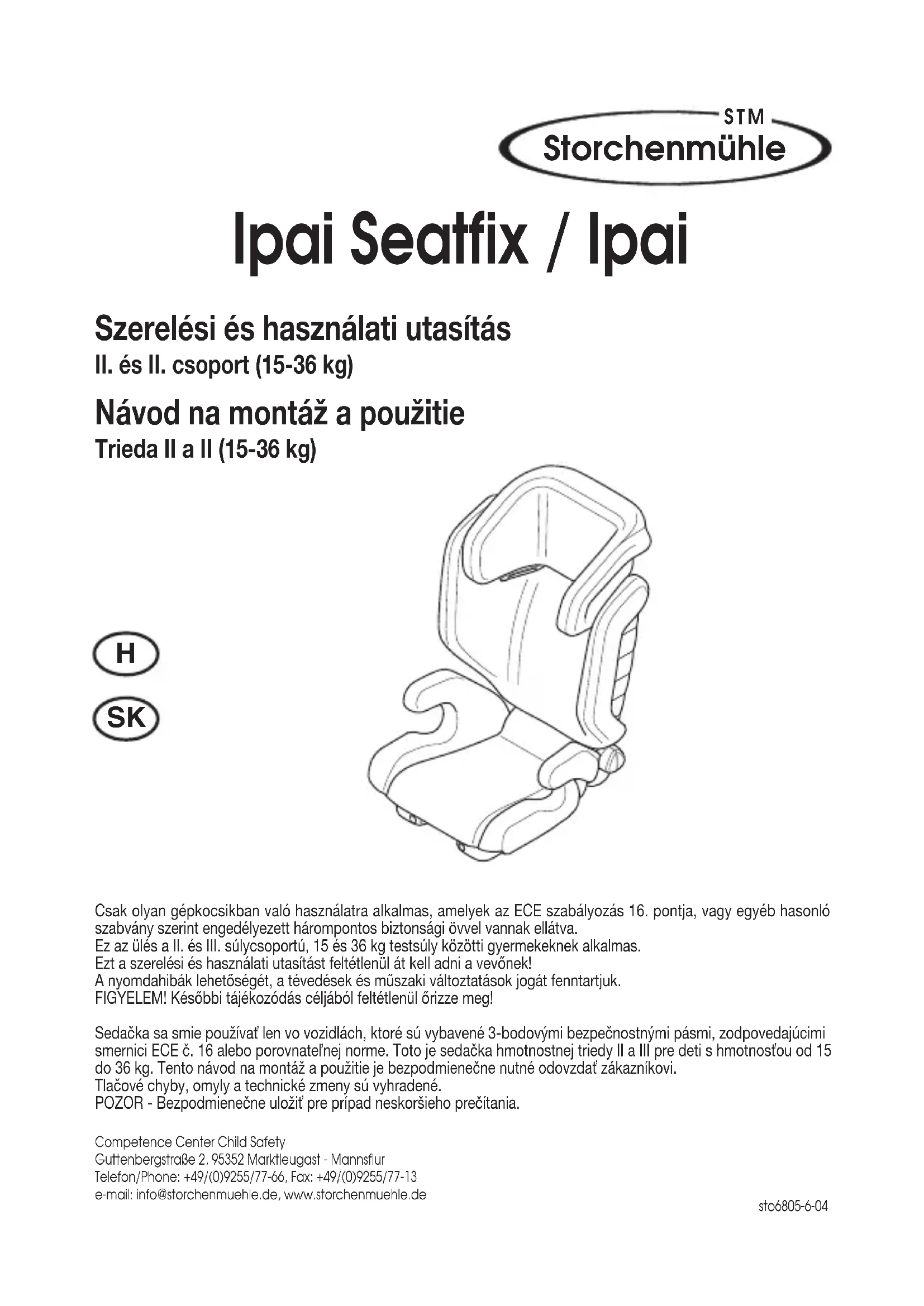 Helyezze a Storchenmühle Ipai gyermekülest a jarmü megfelelo ülesere. Az ülesnek az ECE R16 szerinti vagy ezzel egyenertekü biztonsagi szabványu harompontos biztonsagi övvel kell rendelkeznie.