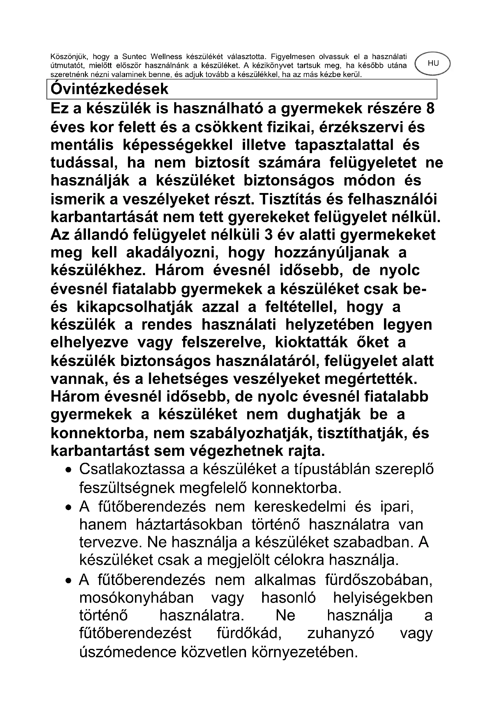 Heat Safe compact SUNTEC WELLNESS GMBH / HOLZSTRASSE 2 / 40 221 DÜSSELDORF / GERMANYSE Köszönjük, hogy a Suntec Wellness készülékét választotta. Figyelmesen olvassuk el a használati útmutatót, mielőtt először használnánk a készüléket. A kézikönyvet tartsuk meg, ha később utána szeretnénk nézni valaminek benne, és adjuk tovább a készülékkel, ha az más kézbe kerül. Óvintézkedések Ez a készülék is használható a gyermekek részére 8 éves kor felett és a csökkent fizikai, érzékszervi és mentális képességekkel illetve tapasztalattal és tudással, ha nem biztosít számára felügyeletet ne használják a készüléket biztonságos módon és ismerik a veszélyeket részt. Tisztítás és felhasználói karbantartását nem tett gyerekeket felügyelet nélkül. Az állandó felügyelet nélküli 3 év alatti gyermekeket meg kell akadályozni, hogy hozzányúljanak a készülékhez. Három évesnél idősebb, de nyolc évesnél fiatalabb gyermekek a készüléket csak be- és kikapcsolhatják azzal a feltétellel, hogy a készülék a rendes használati helyzetében legyen elhelyezve vagy felszerelve, kioktatták őket a készülék biztonságos használatáról, felügyelet alatt vannak, és a lehetséges veszélyeket megértették. Három évesnél idősebb, de nyolc évesnél fiatalabb gyermekek a készüléket nem dughatják be a konnektorba, nem szabályozhatják, tisztíthatják, és karbantartást sem végezhetnek rajta.
