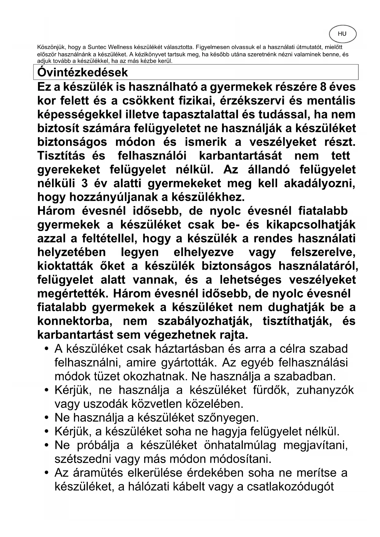 Köszönjük, hogy a Suntec Wellness készülékét választotta. Figyelmesen olvassuk el a használati útmutatót, mielőtt először használnánk a készüléket. A kézikönyvet tartsuk meg, ha később utána szeretnénk nézni valaminek benne, és adjuk tovább a készülékkel, ha az más kézbe kerül. Óvintézkedések Ez a készülék is használható a gyermekek részére 8 éves kor felett és a csökkent fizikai, érzékszervi és mentális képességekkel illetve tapasztalattal és tudással, ha nem biztosít számára felügyeletet ne használják a készüléket biztonságos módon és ismerik a veszélyeket részt. Tisztítás és felhasználói karbantartását nem tett gyerekeket felügyelet nélkül. Az állandó felügyelet nélküli 3 év alatti gyermekeket meg kell akadályozni, hogy hozzányúljanak a készülékhez. Három évesnél idősebb, de nyolc évesnél fiatalabb gyermekek a készüléket csak be- és kikapcsolhatják azzal a feltétellel, hogy a készülék a rendes használati helyzetében legyen elhelyezve vagy felszerelve, kioktatták őket a készülék biztonságos használatáról, felügyelet alatt vannak, és a lehetséges veszélyeket megértették. Három évesnél idősebb, de nyolc évesnél fiatalabb gyermekek a készüléket nem dughatják be a konnektorba, nem szabályozhatják, tisztíthatják, és karbantartást sem végezhetnek rajta.