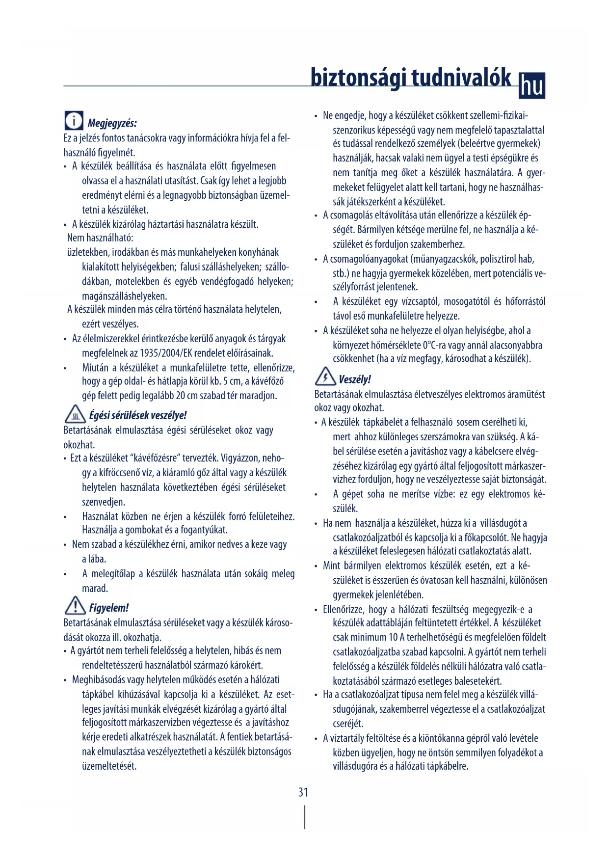 - Ezt a készüléket “kávéfőzésre” tervezték. Vigyázzon, neho- gy a kifröccsenő víz, a kiáramló gőz által vagy a készülék helytelen használata következtében égési sérüléseket szenvedjen.