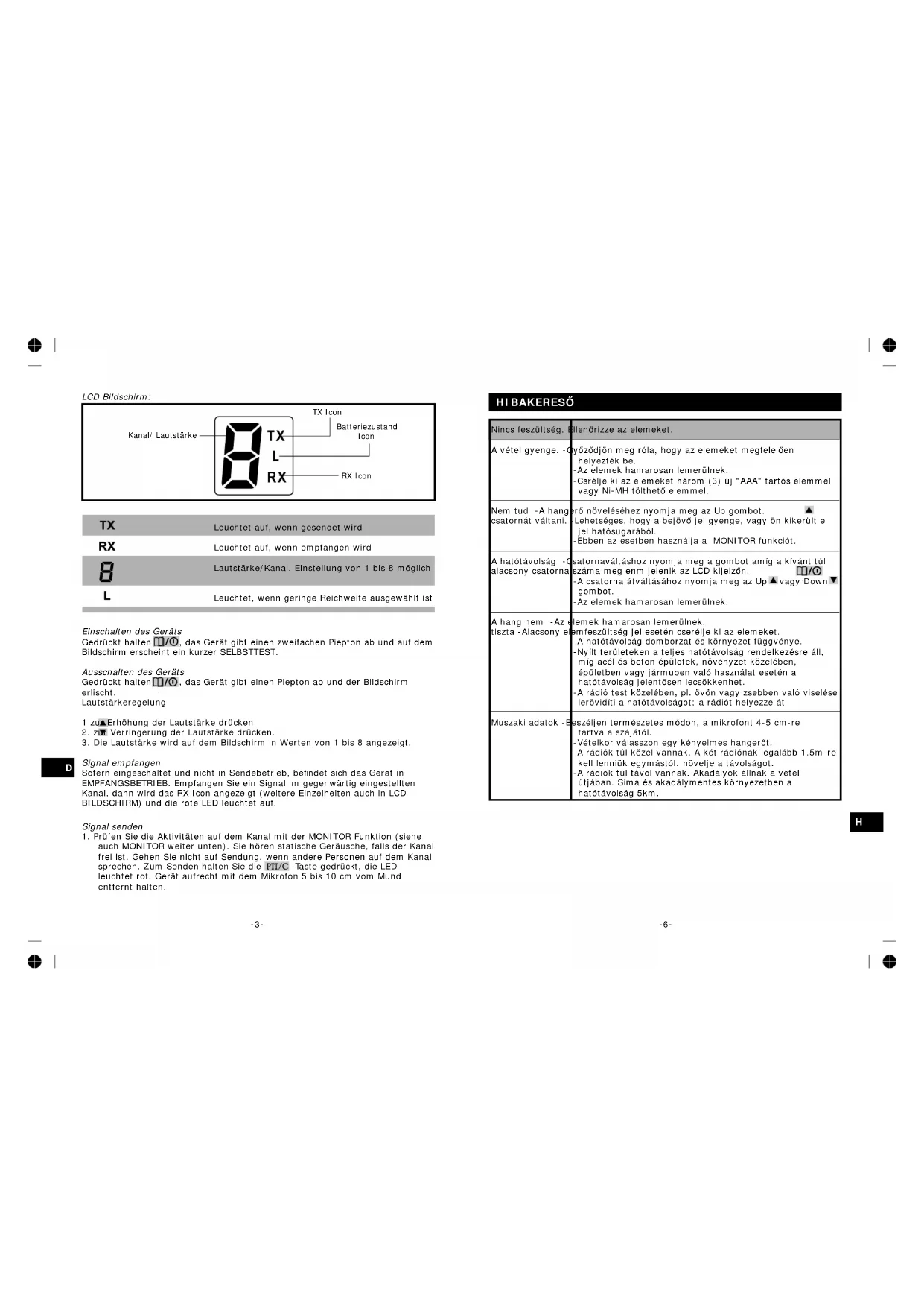 HIBAKERESŐ Nincs feszültség. Ellenőrizze az elemeket. A vétel gyenge. -Győződjön meg róla, hogy az elemeket megfelelően helyezték be. -Az elemek hamarosan lemerülnek. -Csrélje ki az elemeket három (3) új "AAA" tartós elemmel vagy Ni-MH tölthető elemmel. Nem tud -A hangerő növeléséhez nyomja meg az Up gombot. csatornát váltani. -Lehetséges, hogy a bejövő jel gyenge, vagy ön kikerült e jel hatósugarából. -Ebben az esetben használja a MONITOR funkciót. A hatótávolság -Csatornaváltáshoz nyomja meg a gombot amíg a kívánt túl alacsony csatorna száma meg enm jelenik az LCD kijelzőn. -A csatorna átváltásához nyomja meg az Up vagy Down gombot. -Az elemek hamarosan lemerülnek. A hang nem -Az elemek hamarosan lemerülnek. tiszta -Alacsony elemfeszültség jel esetén cserélje ki az elemeket. -A hatótávolság domborzat és környezet függvénye. -Nyílt területeken a teljes hatótávolság rendelkezésre áll, míg acél és beton épületek, növényzet közelében, épületben vagy jármuben való használat esetén a hatótávolság jelentősen lecsökkenhet. -A rádió test közelében, pl. övön vagy zsebben való viselése lerövidíti a hatótávolságot; a rádiót helyezze át Muszaki adatok -Beszéljen természetes módon, a mikrofont 4-5 cm-re tartva a szájától. -Vételkor válasszon egy kényelmes hangerőt. -A rádiók túl közel vannak. A két rádiónak legalább 1.5m-re kell lenniük egymástól: növelje a távolságot. -A rádiók túl távol vannak. Akadályok állnak a vétel útjában. Síma és akadálymentes környezetben a hatótávolság 5km.D