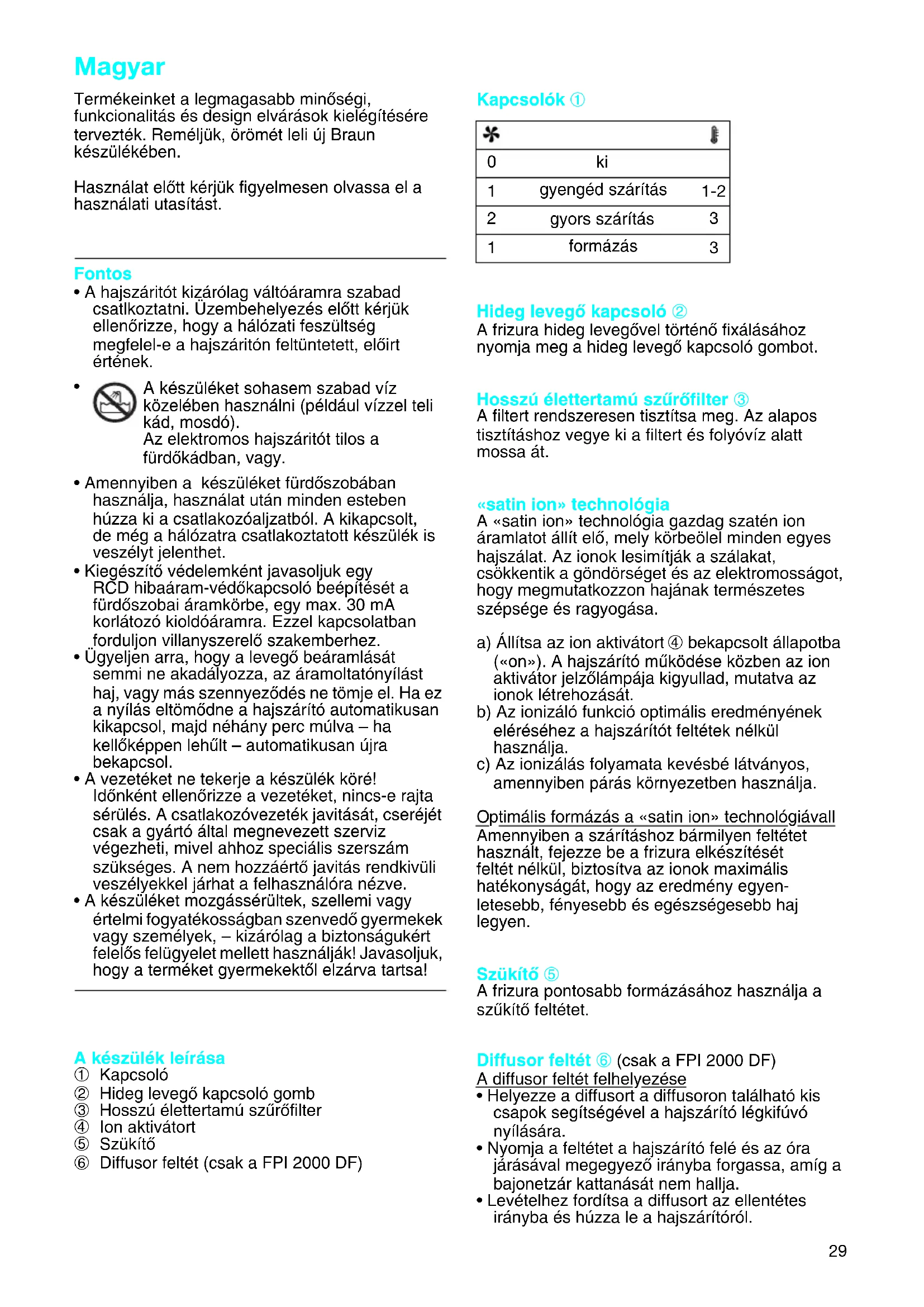 - A készüléket mozgássérültek, szellemi vagy értelmi fogyatékosságban szenvedŒ gyermekek vagy személyek, – kizárólag a biztonságukért felelŒs felügyelet mellett használják! Javasoljuk, hogy a terméket gyermekektŒl elzárva tartsa! A készülék leírása 1 Kapcsoló 2 Hideg levegŒ kapcsoló gomb 3 Hosszú élettertamú szırŒfilter 4 Ion aktivátort 5 SzükítŒ 6 Diffusor feltét (csak a FPI 2000 DF) Kapcsolók 1 Hideg levegŒ kapcsoló 2 A frizura hideg levegŒvel történŒ fixálásához nyomja meg a hideg levegŒ kapcsoló gombot. Hosszú élettertamú szırŒfilter 3 A filtert rendszeresen tisztítsa meg. Az alapos tisztításhoz vegye ki a filtert és folyóvíz alatt mossa át. «satin ion» technológia A «satin ion» technológia gazdag szatén ion áramlatot állít elŒ, mely körbeölel minden egyes hajszálat. Az ionok lesimítják a szálakat, csökkentik a göndörséget és az elektromosságot, hogy megmutatkozzon hajának természetes szépsége és ragyogása. a) Állítsa az ion aktivátort 4 bekapcsolt állapotba («on»). A hajszárító mıködése közben az ion aktivátor jelzŒlámpája kigyullad, mutatva az ionok létrehozását. b) Az ionizáló funkció optimális eredményének eléréséhez a hajszárítót feltétek nélkül használja. c) Az ionizálás folyamata kevésbé látványos, amennyiben párás környezetben használja.