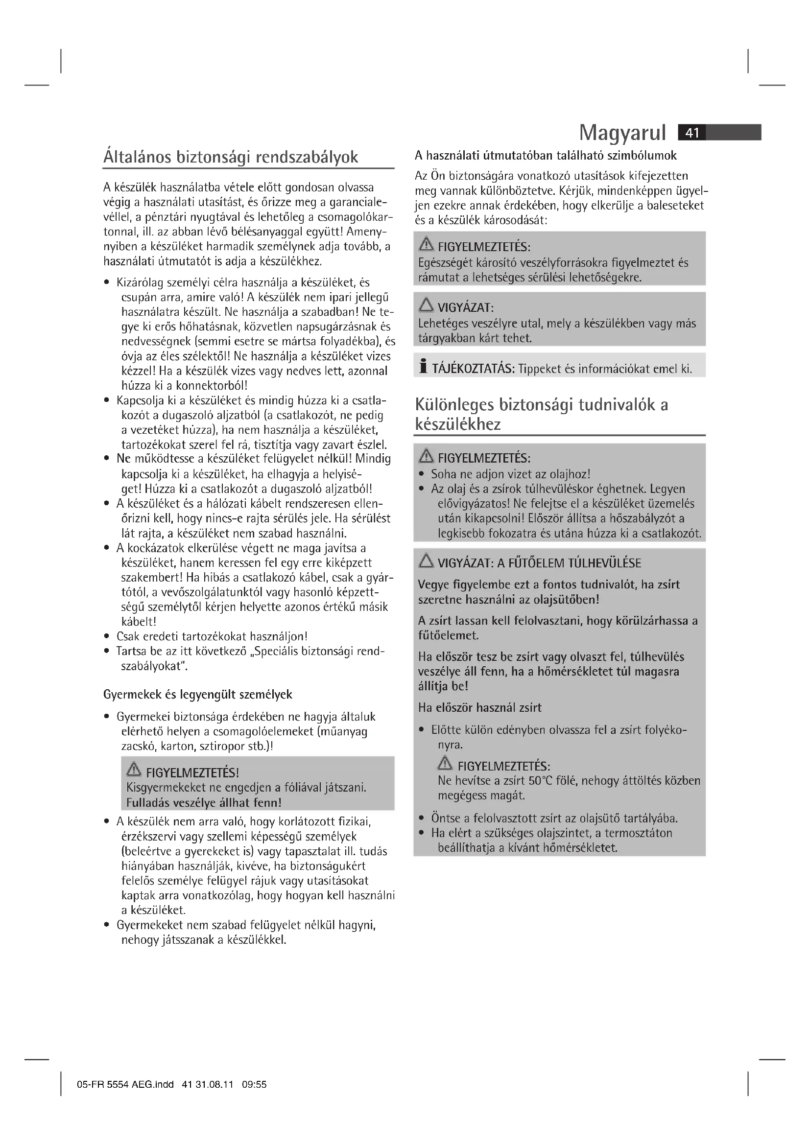 - Ha elért a szükséges olajszintet, a termosztáton beállíthatja a kívánt hőmérsékletet. 05-FR 5554 AEG.indd 41 31.08.11 09:55Magyarul