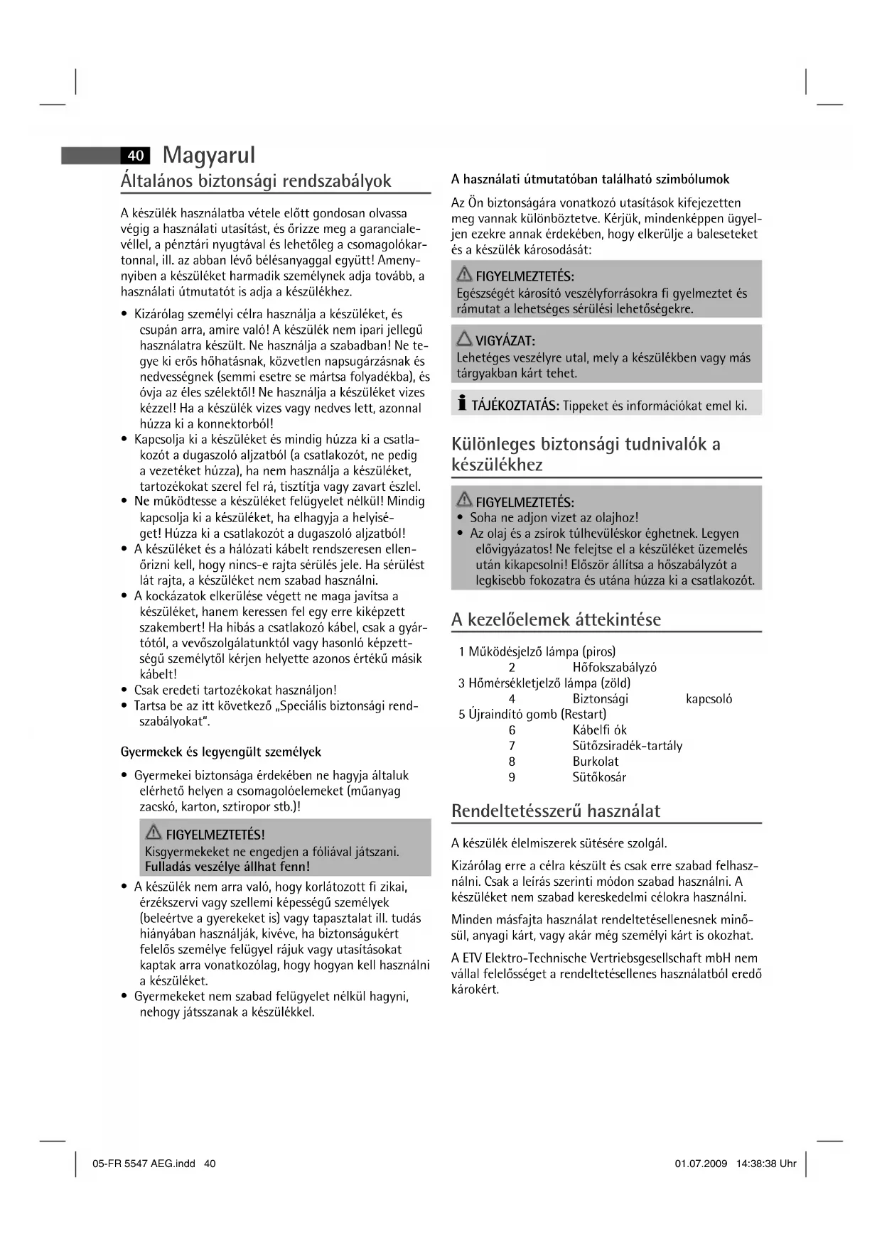 - Az olaj és a zsírok túlhevüléskor éghetnek. Legyen elővigyázatos! Ne felejtse el a készüléket üzemelés után kikapcsolni! Először állítsa a hőszabályzót a legkisebb fokozatra és utána húzza ki a csatlakozót. A kezelőelemek áttekintése 1 Működésjelző lámpa (piros) 2 Hőfokszabályzó 3 Hőmérsékletjelző lámpa (zöld) 4 Biztonsági kapcsoló 5 Újraindító gomb (Restart) 6 Kábel ók 7 Sütőzsiradék-tartály 8 Burkolat 9 Sütőkosár Rendeltetésszerű használat A készülék élelmiszerek sütésére szolgál. Kizárólag erre a célra készült és csak erre szabad felhasz- nálni. Csak a leírás szerinti módon szabad használni. A készüléket nem szabad kereskedelmi célokra használni. Minden másfajta használat rendeltetésellenesnek minő- sül, anyagi kárt, vagy akár még személyi kárt is okozhat. A ETV Elektro-Technische Vertriebsgesellschaft mbH nem vállal felelősséget a rendeltetésellenes használatból eredő károkért. 05-FR 5547 AEG.indd 4005-FR 5547 AEG.indd 40 01.07.2009 14:38:38 Uhr01.07.2009 14:38:38 UhrMagyarul