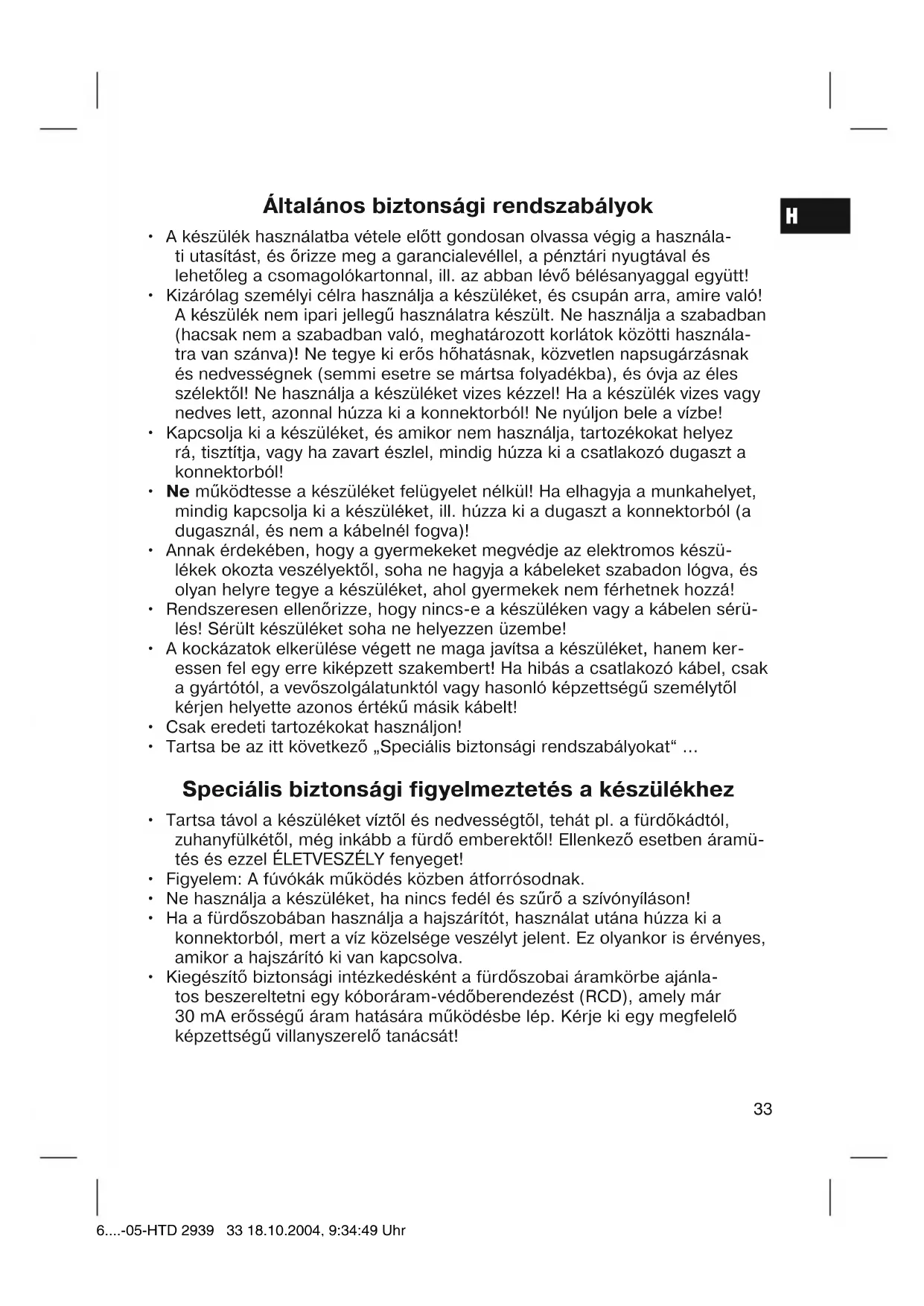 - Kiegészítő biztonsági intézkedésként a fürdőszobai áramkörbe ajánla- tos beszereltetni egy kóboráram-védőberendezést (RCD), amely már 30 mA erősségű áram hatására működésbe lép. Kérje ki egy megfelelő képzettségű villanyszerelő tanácsát! 6....-05-HTD 2939 33 18.10.2004, 9:34:49 UhrH