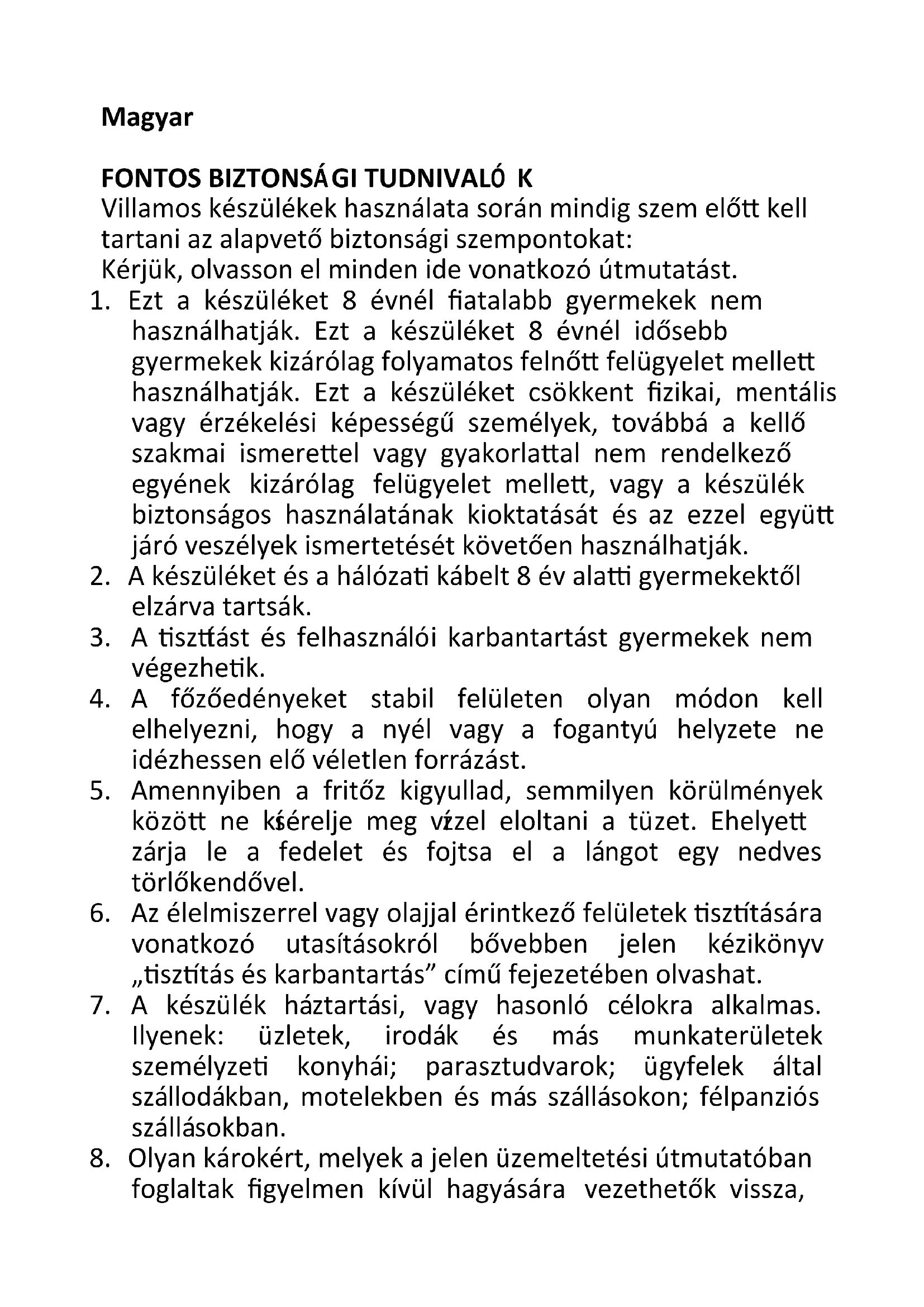 9. Ha a fritőz, vagy a hálózati vezeték károsodott, a javítást csak a hivatalos ügyfélszolgálat végezheti el.