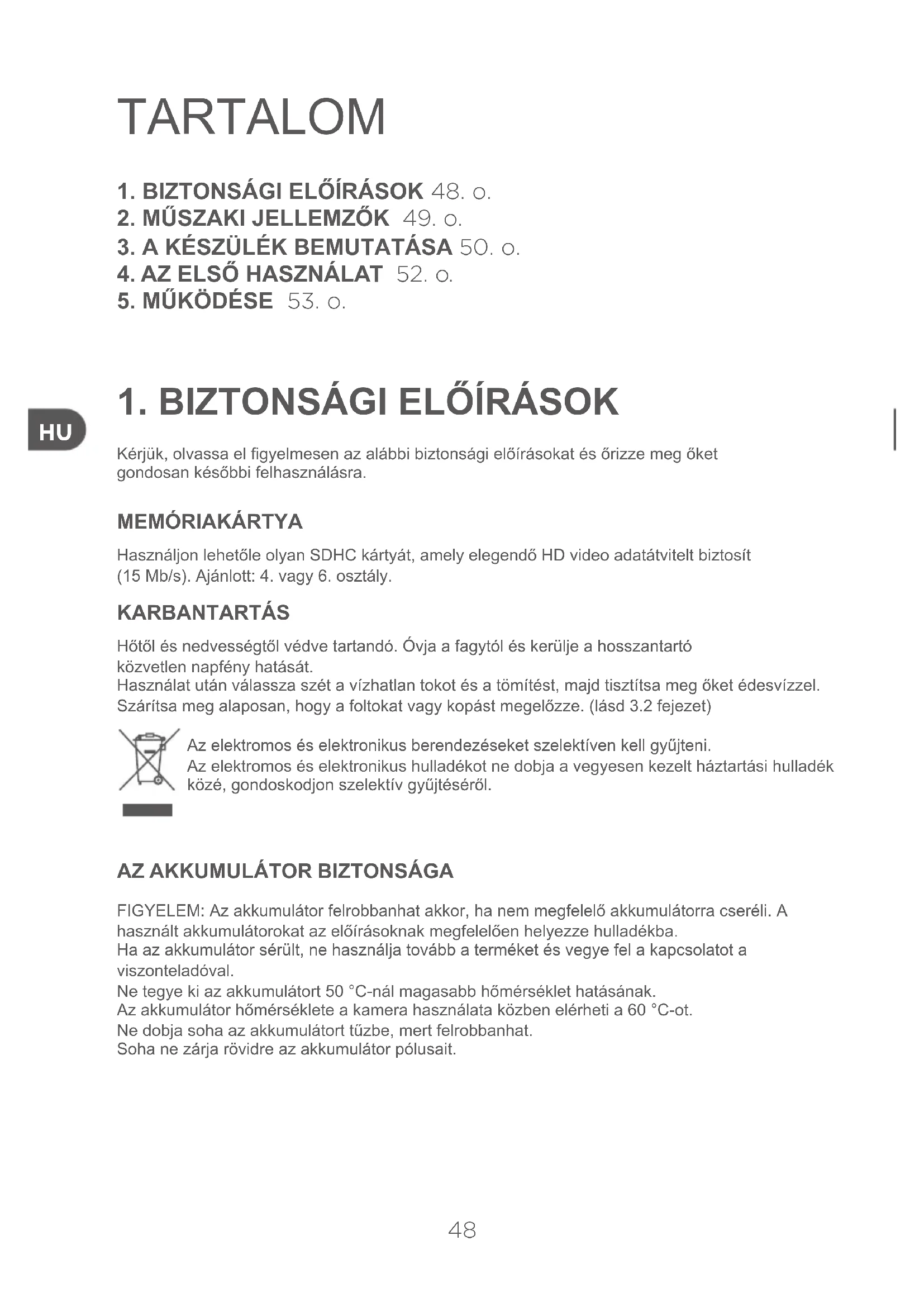 FIGYELEM: Az akkumulátor felrobbanhat akkor, ha nem megfelelő akkumulátorra cseréli. A használt akkumulátorokat az előírásoknak megfelelően helyezze hulladékba. Ha az akkumulátor sérült, ne használja tovább a terméket és vegye fel a kapcsolatot a viszonteladóval. Ne tegye ki az akkumulátort 50 °C-nál magasabb hőmérséklet hatásának.Az akkumulátor hőmérséklete a kamera használata közben elérheti a 60 °C-ot.Ne dobja soha az akkumulátort tűzbe, mert felrobbanhat. Soha ne zárja rövidre az akkumulátor pólusait. TARTALOM