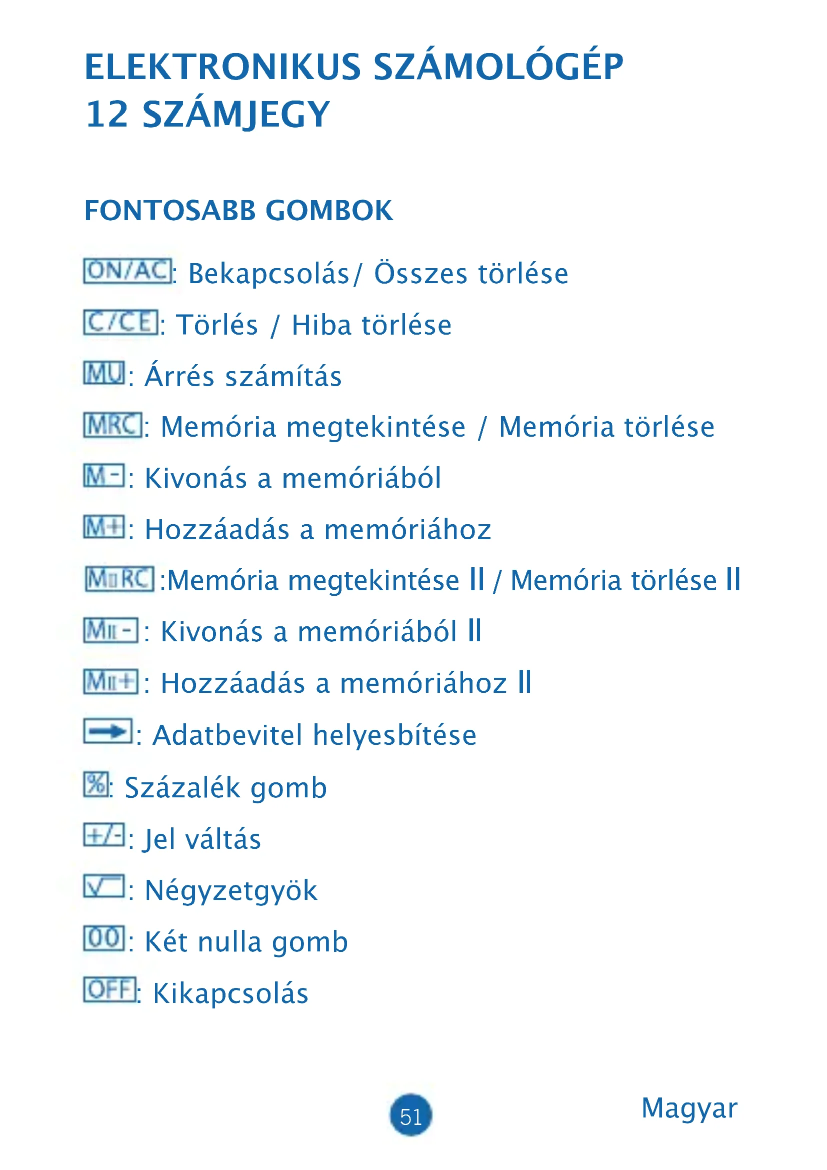 12 SZÁMJEGY FONTOSABB GOMBOK : Bekapcsolás/ Összes törlése : Törlés / Hiba törlése : Árrés számítás : Memória megtekintése / Memória törlése : Kivonás a memóriából : Hozzáadás a memóriához :Memória megtekintése II / Memória törlése II : Kivonás a memóriából II : Hozzáadás a memóriához II : Adatbevitel helyesbítése : Százalék gomb : Jel váltás : Négyzetgyök : Két nulla gomb : Kikapcsolás Magyar52 VÁLTÓGOMBOK LEÍRÁSA:
