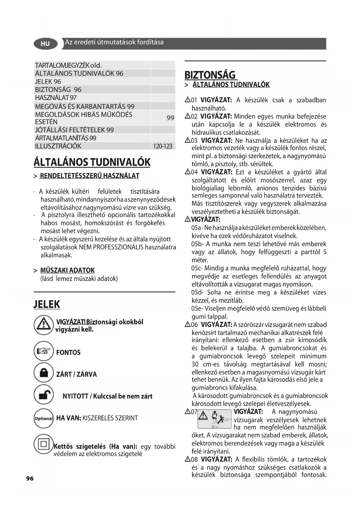 - 03 VIGYÁZAT: Ne használja a készüléket ha az elektromos vezeték vagy a készülék fontos részei, mint pl. a biztonsági szerkezetek, a nagynyomású tömlő, a pisztoly, stb. sérültek.