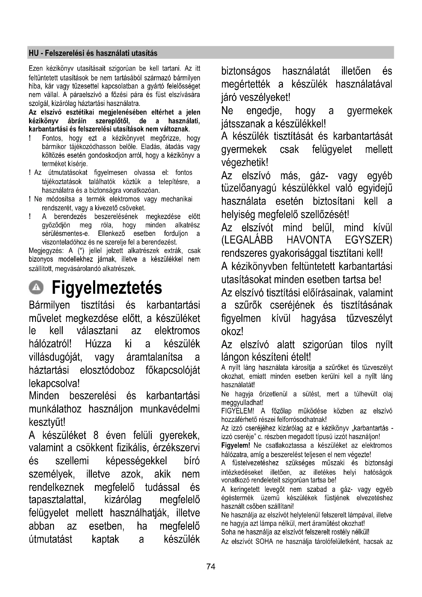 Ak by osvetlenie nefungovalo, skôr ako zavoláte servis overte správne nasadenie žiaroviek do sedla.74 HU - Felszerelési és használati utasítás Ezen kézikönyv utasításait szigorúan be kell tartani. Az itt feltüntetett utasítások be nem tartásából származó bármilyen hiba, kár vagy tűzesettel kapcsolatban a gyártó felelősséget nem vállal. A páraelszívó a főzési pára és füst elszívására szolgál, kizárólag háztartási használatra. Az elszívó esztétikai megjelenésében eltérhet a jelen kézikönyv ábráin szereplőtől, de a használati, karbantartási és felszerelési utasítások nem változnak. ! Fontos, hogy ezt a kézikönyvet megőrizze, hogy bármikor tájékozódhasson belőle. Eladás, átadás vagy költözés esetén gondoskodjon arról, hogy a kézikönyv a terméket kísérje. ! Az útmutatásokat figyelmesen olvassa el: fontos tájékoztatások találhatók köztük a telepítésre, a használatra és a biztonságra vonatkozóan. ! Ne módosítsa a termék elektromos vagy mechanikai rendszerét, vagy a kivezető csöveket. ! A berendezés beszerelésének megkezdése előtt győződjön meg róla, hogy minden alkatrész sérülésmentes-e. Ellenkező esetben forduljon a viszonteladóhoz és ne szerelje fel a berendezést. Megjegyzés: A (*) jellel jelzett alkatrészek extrák, csak bizonyos modellekhez járnak, illetve a készülékkel nem szállított, megvásárolandó alkatrészek. Figyelmeztetés Bármilyen tisztítási és karbantartási művelet megkezdése előtt, a készüléket le kell választani az elektromos hálózatról! Húzza ki a készülék villásdugóját, vagy áramtalanítsa a háztartási elosztódoboz főkapcsolóját lekapcsolva! Minden beszerelési és karbantartási munkálathoz használjon munkavédelmi kesztyűt! A készüléket 8 éven felüli gyerekek, valamint a csökkent fizikális, érzékszervi és szellemi képességekkel bíró személyek, illetve azok, akik nem rendelkeznek megfelelő tudással és tapasztalattal, kizárólag megfelelő felügyelet mellett használhatják, illetve abban az esetben, ha megfelelő útmutatást kaptak a készülék biztonságos használatát illetően és megértették a készülék használatával járó veszélyeket! Ne engedje, hogy a gyermekek játsszanak a készülékkel! A készülék tisztítását és karbantartását gyermekek csak felügyelet mellett végezhetik! Az elszívó más, gáz- vagy egyéb tüzelőanyagú készülékkel való egyidejű használata esetén biztosítani kell a helyiség megfelelő szellőzését! Az elszívót mind belül, mind kívül (LEGALÁBB HAVONTA EGYSZER) rendszeres gyakorisággal tisztítani kell! A kézikönyvben feltüntetett karbantartási utasításokat minden esetben tartsa be! Az elszívó tisztítási előírásainak, valamint a szűrők cseréjének és tisztításának figyelmen kívül hagyása tűzveszélyt okoz! Az elszívó alatt szigorúan tilos nyílt lángon készíteni ételt! A nyílt láng használata károsítja a szűrőket és tűzveszélyt okozhat, emiatt minden esetben kerülni kell a nyílt láng használatát! Ne hagyja őrizetlenül a sütést, mert a túlhevült olaj meggyulladhat! FIGYELEM! A főzőlap működése közben az elszívó hozzáférhető részei felforrósodhatnak! Az izzó cseréjéhez kizárólag az e kézikönyv „karbantartás - izzó cseréje” c. részben megadott típusú izzót használjon! Figyelem! Ne csatlakoztassa a készüléket az elektromos hálózatra, amíg a beszerelést teljesen el nem végezte! A füstelvezetéshez szükséges műszaki és biztonsági intézkedéseket illetően, az illetékes helyi hatóságok vonatkozó rendeleteit szigorúan tartsa be! A keringetett levegőt nem szabad a gáz- vagy egyéb égéstermék üzemű készülékek füstjének elvezetéshez használt csőben szállítani! Ne használja az elszívót helytelenül felszerelt lámpával, illetve ne hagyja azt lámpa nélkül, mert áramütést okozhat! Soha ne használja az elszívót felszerelt rostély nélkül! Az elszívót SOHA ne használja tárolófelületként, hacsak az75 ilyen célra való használata nincs egyértelműen jelezve! Beszereléshez kizárólag a készülékhez mellékelt csavarokat használja! Amennyiben a csavar nem része a csomagnak, ügyeljen a megfelelő típusú csavarok beszerezésére! A beszerelési útmutatóban feltüntetett, megfelelő hosszúságú csavarokat használjon! Kétség esetén kérjen tájékoztatást a szakszerviztől, vagy hasonló képesítésű személyzettől! FIGYELEM! A csavarok és rögzítő elemeknek nem az útmutató szerinti felhelyezése áramütés-veszélyt okozhat! A készüléken található jelzés megfelel az elektromos és elektronikus berendezések hulladékairól szóló 2012/19/EC európai irányelvben (WEEE) foglalt előírásoknak. A hulladékká vált termék szabályszerű elhelyezésével Ön segít elkerülni a környezettel és az emberi egészséggel kapcsolatos azon esetleges negatív következményeket, amelyeket a termék nem megfelelő hulladékkezelése egyébként okozhatna. A terméken vagy a termékhez mellékelt dokumentumokon feltüntetett jelzés arra utal, hogy ez a termék nem kezelhető háztartási hulladékként. Ehelyett a terméket a villamos és elektronikus berendezések újrahasznosítását végző telephelyek valamelyikén kell leadni. Kiselejtezéskor a hulladékeltávolításra vonatkozó helyi környezetvédelmi előírások szerint kell eljárni. A termék kezelésével, hasznosításával és újrahasznosításával kapcsolatos bővebb tájékoztatásért forduljon a lakóhelye szerinti polgármesteri hivatalhoz, a háztartási hulladékok kezelését végző társasághoz vagy ahhoz a bolthoz, ahol a terméket vásárolta. A berendezést a következő szabványoknak megfelelően tervezték, gyártották, és ellenőrizték: