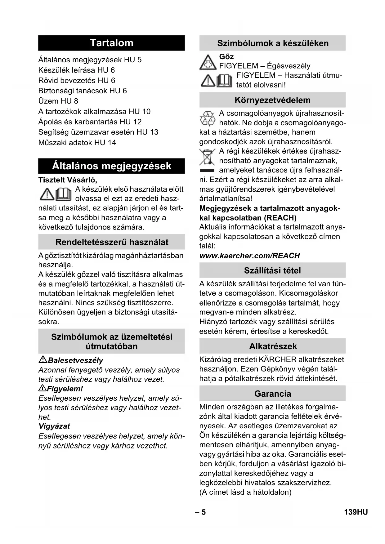 (принадлежностей) 3,1 кг Ширина 250 мм Длина 382 мм высота 256 мм 138 RUMagyar – 5 Tisztelt Vásárló, A készülék első használata előtt olvassa el ezt az eredeti hasz- nálati utasítást, ez alapján járjon el és tart- sa meg a későbbi használatra vagy a következő tulajdonos számára. A gőztisztítót kizárólag magánháztartásban használja. A készülék gőzzel való tisztításra alkalmas és a megfelelő tartozékkal, a használati út- mutatóban leírtaknak megfelelően lehet használni. Nincs szükség tisztítószerre. Különösen ügyeljen a biztonsági utasítá- sokra. Balesetveszély Azonnal fenyegető veszély, amely súlyos testi sérüléshez vagy halálhoz vezet. 몇 Figyelem! Esetlegesen veszélyes helyzet, amely sú- lyos testi sérüléshez vagy halálhoz vezet- het. Vigyázat Esetlegesen veszélyes helyzet, amely kön- nyű sérüléshez vagy kárhoz vezethet. Gőz FIGYELEM – Égésveszély FIGYELEM – Használati útmu- tatót elolvasni! A csomagolóanyagok újrahasznosít- hatók. Ne dobja a csomagolóanyago- kat a háztartási szemétbe, hanem gondoskodjék azok újrahasznosításról. A régi készülékek értékes újrahasz- nosítható anyagokat tartalmaznak, amelyeket tanácsos újra felhasznál- ni. Ezért a régi készülékeket az arra alkal- mas gyűjtőrendszerek igénybevételével ártalmatlanítsa! Megjegyzések a tartalmazott anyagok- kal kapcsolatban (REACH) Aktuális információkat a tartalmazott anya- gokkal kapcsolatosan a következő címen talál: www.kaercher.com/REACH A készülék szállítási terjedelme fel van tün- tetve a csomagoláson. Kicsomagoláskor ellenőrizze a csomagolás tartalmát, hogy megvan-e minden alkatrész. Hiányzó tartozék vagy szállítási sérülés esetén kérem, értesítse a kereskedőt. Kizárólag eredeti KÄRCHER alkatrészeket használjon. Ezen Gépkönyv végén talál- hatja a pótalkatrészek rövid áttekintését. Minden országban az illetékes forgalma- zónk által kiadott garancia feltételek érvé- nyesek. Az esetleges üzemzavarokat az Ön készülékén a garancia lejártáig költség- mentesen elhárítjuk, amennyiben anyag- vagy gyártási hiba az oka. Garanciális eset- ben kérjük, forduljon a vásárlást igazoló bi- zonylattal kereskedőjéhez vagy a legközelebbi hivatalos szakszervizhez. (A címet lásd a hátoldalon) Tartalom Általános megjegyzések HU 5 Készülék leírása HU 6 Rövid bevezetés HU 6 Biztonsági tanácsok HU 6 Üzem HU 8 A tartozékok alkalmazása HU 10 Ápolás és karbantartás HU 12 Segítség üzemzavar esetén HU 13 Műszaki adatok HU 14 Általános megjegyzések Rendeltetésszerű használat Szimbólumok az üzemeltetési útmutatóban Szimbólumok a készüléken Környezetvédelem Szállítási tétel Alkatrészek Garancia 139HU– 6 Jelen használati útmutatóban a maximális felszereltség van leírva. A szállítási terjede- lem modellenként eltérő (lásd a csomago- láson). Az ábrákat lásd a kihajtha- tó oldalon! Ábrákat lásd a 2. oldalon 1 A biztonsági zárat lecsavarni, és a gőz- tisztítót maximum 1 liter vízzel feltölteni. 2 Csavarja be a biztonsági zárat. 3A gőztömlő dugóját csatlakoztatni kell a készülék aljzatába. 4 Dugja be a hálózati csatlakozót. Kapcsolja be a kÈsz¸lÈket. A zöld és a narancssárga jelzőlámpa vi- lágít. 5 Várjon, amíg elalszik a narancssárga jelzőlámpa. 6 Csatlakoztassa a tartozékot a gőzpisz- tolyhoz. A gőztisztító használatra kész. Balesetveszély Tilos a tűzveszélyes helyiségekben tör- ténő üzemeltetés. A készülék veszélyes területen történő alkalmazása során figyelembe kell ven- ni a megfelelő biztonsági előírásokat. A készüléket ne használja olyan úszó- medencében, amely vizet tartalmaz. A készüléket nem szabad elektromos készülékek pl. tűzhelyek, szagelszívók, mikrohullámú sütők, televíziók, lámpák, hajszárítók, elektromos fűtőtestek, stb. tisztítására használni. A készülék és a tartozék előírásszerű állapotát használat előtt ellenőrizni kell. Ha a készülék állapota nem kifogásta- lan, akkor nem szabad használni. Ké- rem, különösen ellenőrizze a hálózati csatlakozóvezetéket, a biztonsági zárat és a gőztömlőt. A sérült hálózati csatlakozóvezetéket azonnal cseréltesse ki felhatalmazott szervizzel/villamos szakemberrel. A sérült gőztömlőt azonnal cserélje ki. Csak a gyártó által ajánlott gőztömlőt (a rendelési számot lásd a pótalkatrész listában) szabad alkalmazni. Ne fogja meg nedves kézzel a hálózati csatlakozót és dugaljat. Készülék leírása A1 A készülék fedeles csatlakozóaljzata A2 Jelzőlámpa - fűtés (NARANCSSÁRGA) A3 Jelzőlámpa (zöld) - van hálózati fe- szültség A4 Kapcsoló – Be A5 Kapcsoló – Ki A6 Biztonsági zár A7 Tartozék tartója A8 Parkoló tartó a padlófej számára A9 Hálózati csatlakozóvezeték hálózati csatlakozóval A10Futókerekek (2 darab) A11Kormánygörgő B1 Gőzpisztoly B2 Kibiztosító gomb B3 Választókapcsoló a gőzmennyiséghez (gyermekzárral) B4 Gőzkar B5 Gőztömlő B6 Gőzdugasz C1 Pontszórófej C2 Körkefe C3 Power szórófej D1 Kézi szórófej D2 Frottírhuzat E1 Hosszabbítócsövek (2 db.) E2 Kibiztosító gomb F1 Padló szórófej F2 Tartókapocs F3 Törlőruha G1 Ablaklehúzó Opcionális H1 Gőznyomásos vasaló H2 Gőz kapcsoló (lent) H3 Jelzőlámpa - fűtés (NARANCSSÁRGA) H4 Gőz kapcsoló (fent) H5 Gőz kapcsoló zárja H6 Hőmérséklet-szabályozó H7 Gőzdugasz Rövid bevezetés Biztonsági tanácsok 140 HU– 7 Nem szabad olyan tárgyat kezelni a gőzsugárral, amely egészségre káros anyagot (pl. azbesztet) tartalmaz.. A gőzsugarat nem szabad kis távolság- ból kézzel megérinteni, emberre, illetve állatra irányítani (forrázásveszély). 몇 Figyelem! A készülék IEC 60364-nek megf