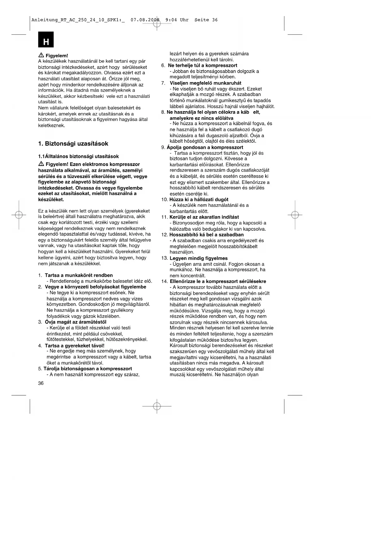 - A kompresszor további használata előtt a biztonsági berendezéseket vagy enyhén sérült részeket meg kell gondosan vizsgálni azok hibátlan és meghatározásuknak megfelelő működésükre. Vizsgálja meg, hogy a mozgó részek működése rendben van, és hogy nem szorulnak vagy részeik nincsennek károsulva. Minden résznek helyesen fel kell szerelve lennie és minden feltételt teljesítenie, hogy a szerszám kifogástalan müködése biztosítva legyen. Károsult biztonsági berendezéseket és részeket szakszerüen egy vevőszolgálati műhely által kell megjavítattni vagy kicseréltetni, ha a használati utasításban nincs más megadva. A károsult kapcsolókat egy vevőszolgálati műhely által muszáj kicseréltetni. Ne használjon olyan Anleitung_RT_AC_250_24_10_SPK1:_ 07.08.2008 9:04 Uhr Seite 36H