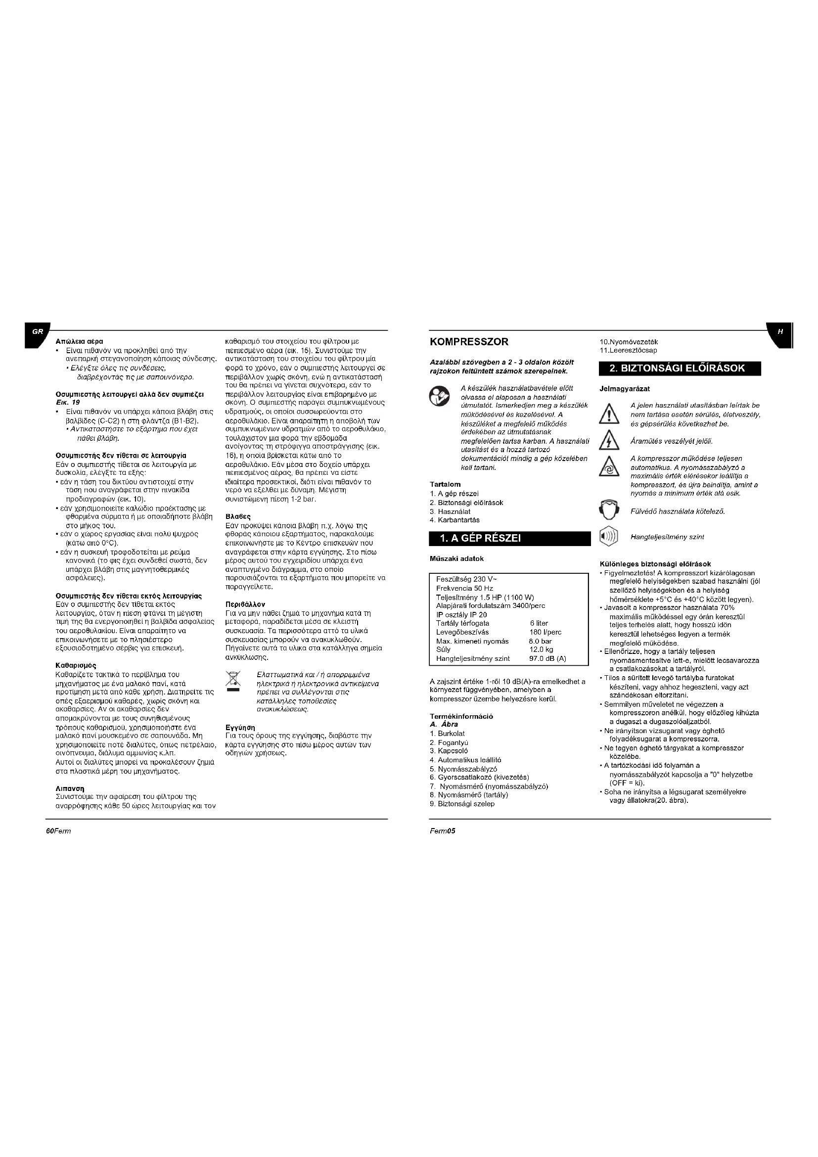 Ferm 05 KOMPRESSZOR Azalábbi szövegben a 2 - 3 oldalon közölt rajzokon feltüntett számok szerepelnek. A készülék használatbavétele előtt olvassa el alaposan a használati útmutatót. Ismerkedjen meg a készülék működésével és kezelésével. A készüléket a megfelelő működés érdekében az útmutatásnak megfelelően tartsa karban. A használati utasítást és a hozzá tartozó dokumentációt mindig a gép közelében kell tartani. Tartalom