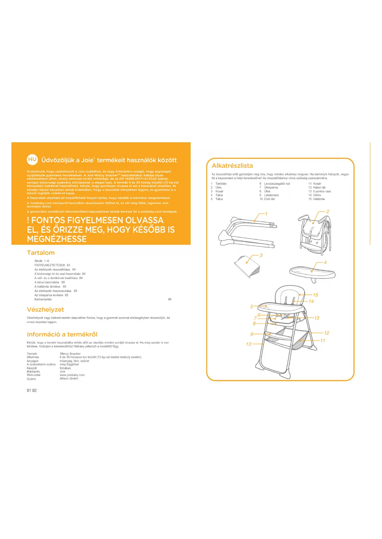 EL, ÉS ŐRIZZE MEG, HOGY KÉSŐBB IS MEGNÉZHESSE Tartalom Ábrák 1–6 FIGYELMEZTETÉSEK 83 Az etetőszék összeállítása 84A biztonsági öv és csat használata 84A váll- és a derékövek beállítása 84A tálca használata 85A háttámla döntése 85Az etetőszék összecsukása 85Az üléspárna levétele 85Karbantartás 86 Vészhelyzet Vészhelyzet vagy baleset esetén alapvetően fontos, hogy a gyermek azonnal elsősegélyben részesüljön, és orvosi kezelést kapjon. Információ a termékről Kérjük, hogy a termék használatba vétele előtt az utasítás minden pontját olvassa el. Ha még azután is van kérdése, forduljon a kereskedőhöz! Néhány jellemző a modelltől függ.Termék Mimzy SnackerAlkalmas 6 és 36 hónapos kor között (15 kg-nál kisebb testsúly esetén)Anyagok műanyag, fém, szövetA szabadalom száma még függőbenKészült KínábanMárkanév JoieWeb-oldal www.joiebaby.comGyártó Allison GmbH Alkatrészlista Az összeállítás előtt győződjön meg róla, hogy minden alkatrész megvan. Ha bármelyik hiányzik, vegye fel a kapcsolatot a helyi kereskedővel! Az összeállításhoz nincs szükség szerszámokra.