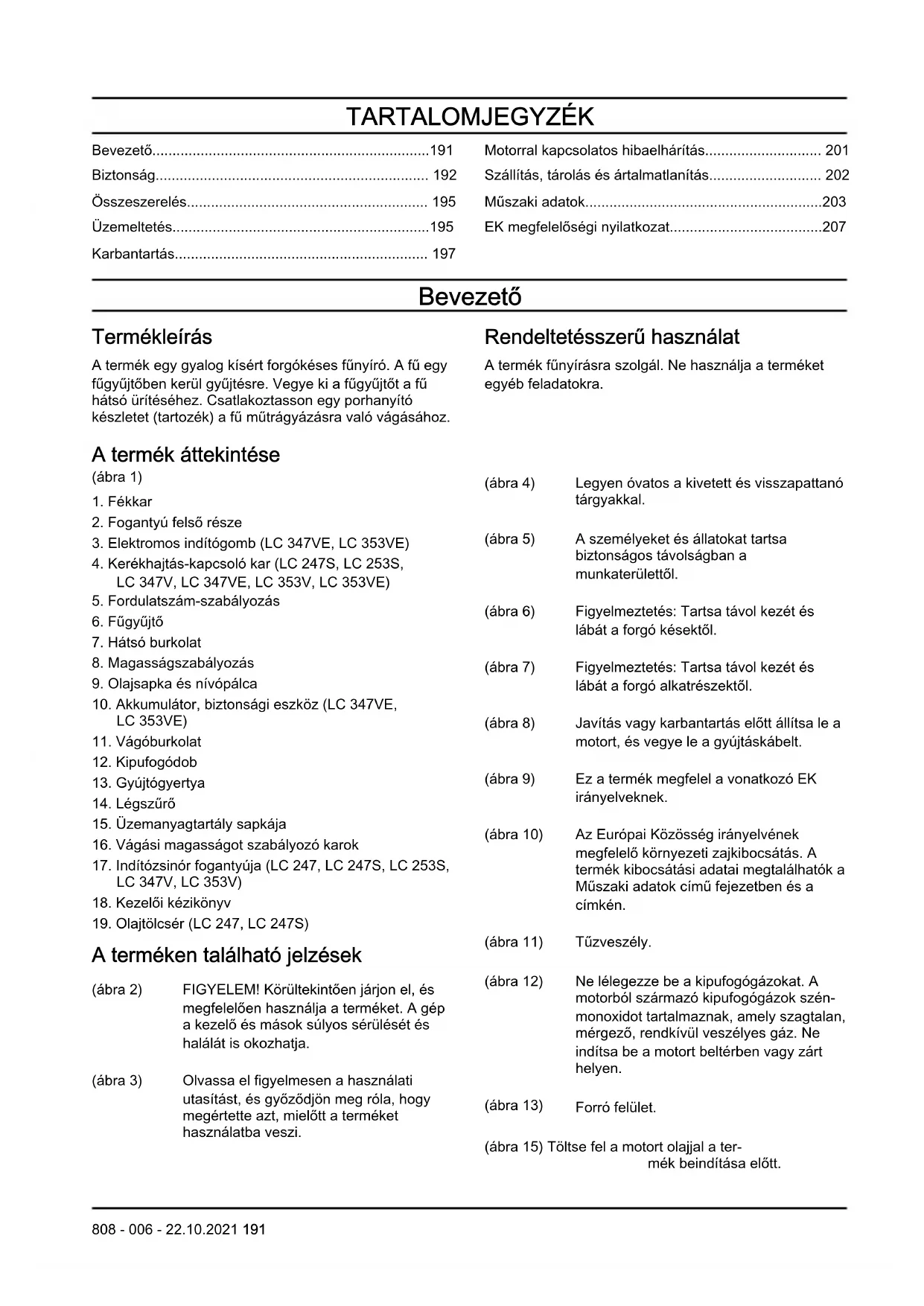 LC 247S, LC 253S, LC 347V, LC 353V esetében: Nyomja a fékkart lefelé, majd húzza meg az indítózsinór fogantyú- ját. (ábra 17) Indítási eljárás az LC 347VE, LC 353VE esetében: Nyomja le a motorfékkart, és nyomja meg az indítógombot. (ábra 14) Beolvasható kód. Megjegyzés: A terméken szereplő többi jelölés/ címke a további piacok specifikus vizsgáztatási követelményeire vonatkozik. Euro V. kibocsátási norma FIGYELMEZTETÉS: A motor módosítása érvényteleníti a termékre vonatkozó európai uniós típusjóváhagyást. Termékszavatosság A termékszavatosságra vonatkozó jogszabályok értelmében nem vagyunk felelősek a termékeink által okozott károkért az alábbi esetekben: