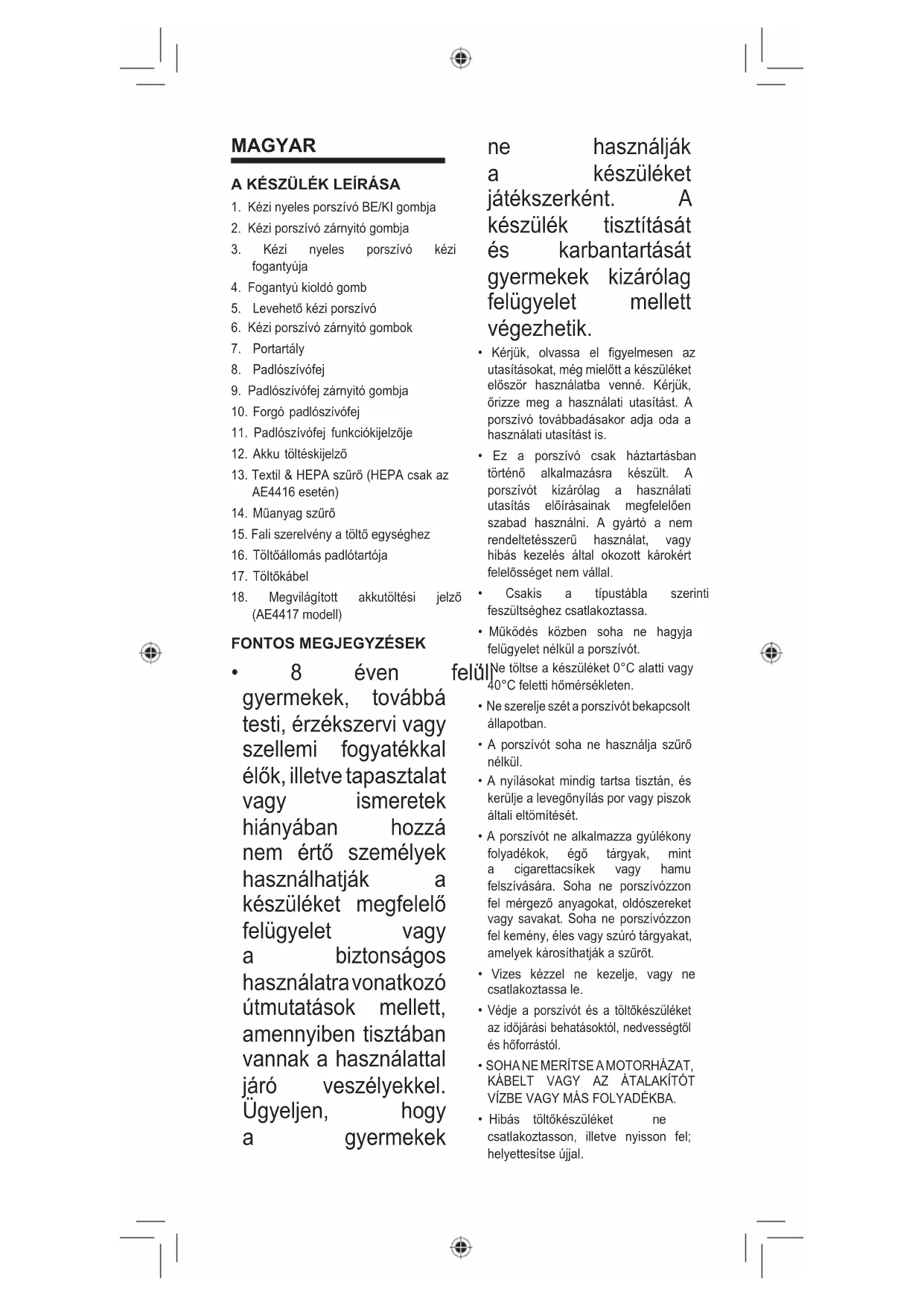 - 8 éven felüli gyermekek, továbbá testi, érzékszervi vagy szellemi fogyatékkal élők, illetve tapasztalat vagy ismeretek hiányában hozzá nem értő személyek használhatják a készüléket megfelelő felügyelet vagy a biztonságos használatra vonatkozó útmutatások mellett, amennyiben tisztában vannak a használattal járó veszélyekkel. Ügyeljen, hogy a gyermekek ne használják a készüléket játékszerként. A készülék tisztítását és karbantartását gyermekek kizárólag felügyelet mellett végezhetik.