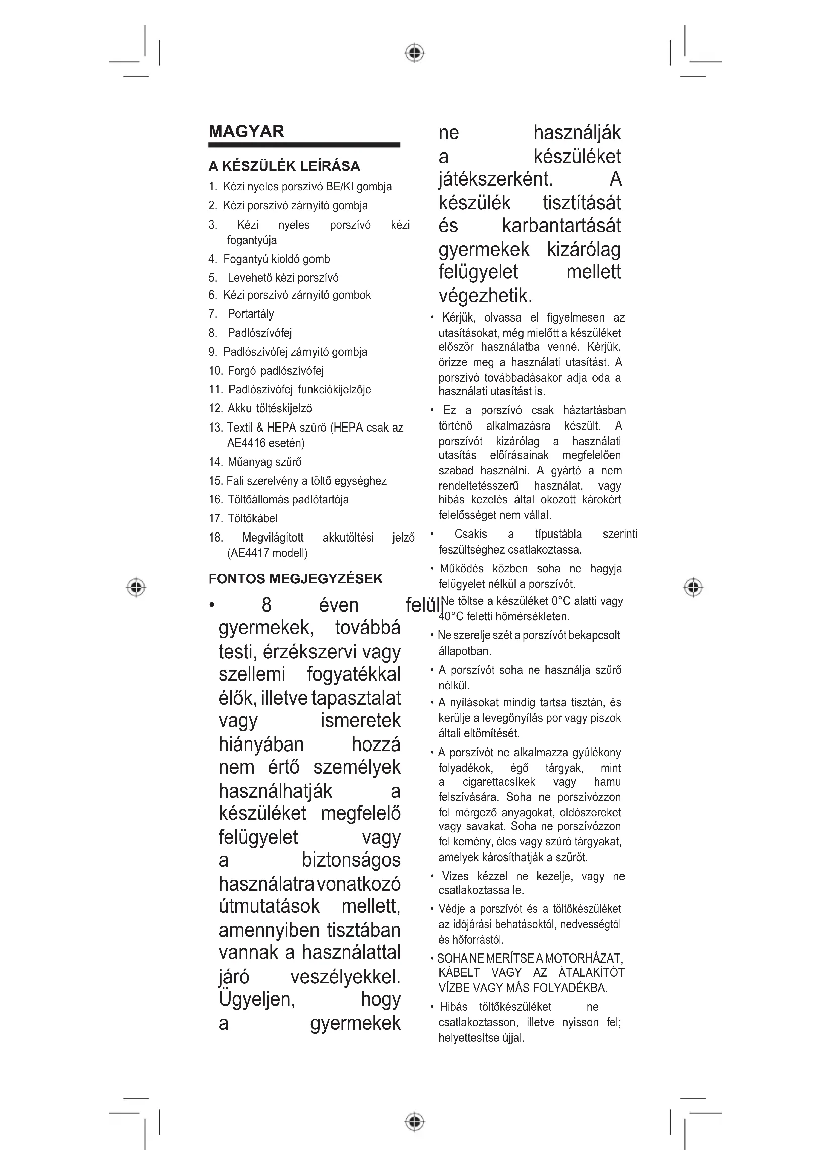 - 8 éven felüli gyermekek, továbbá testi, érzékszervi vagy szellemi fogyatékkal élők, illetve tapasztalat vagy ismeretek hiányában hozzá nem értő személyek használhatják a készüléket megfelelő felügyelet vagy a biztonságos használatra vonatkozó útmutatások mellett, amennyiben tisztában vannak a használattal járó veszélyekkel. Ügyeljen, hogy a gyermekek ne használják a készüléket játékszerként. A készülék tisztítását és karbantartását gyermekek kizárólag felügyelet mellett végezhetik.