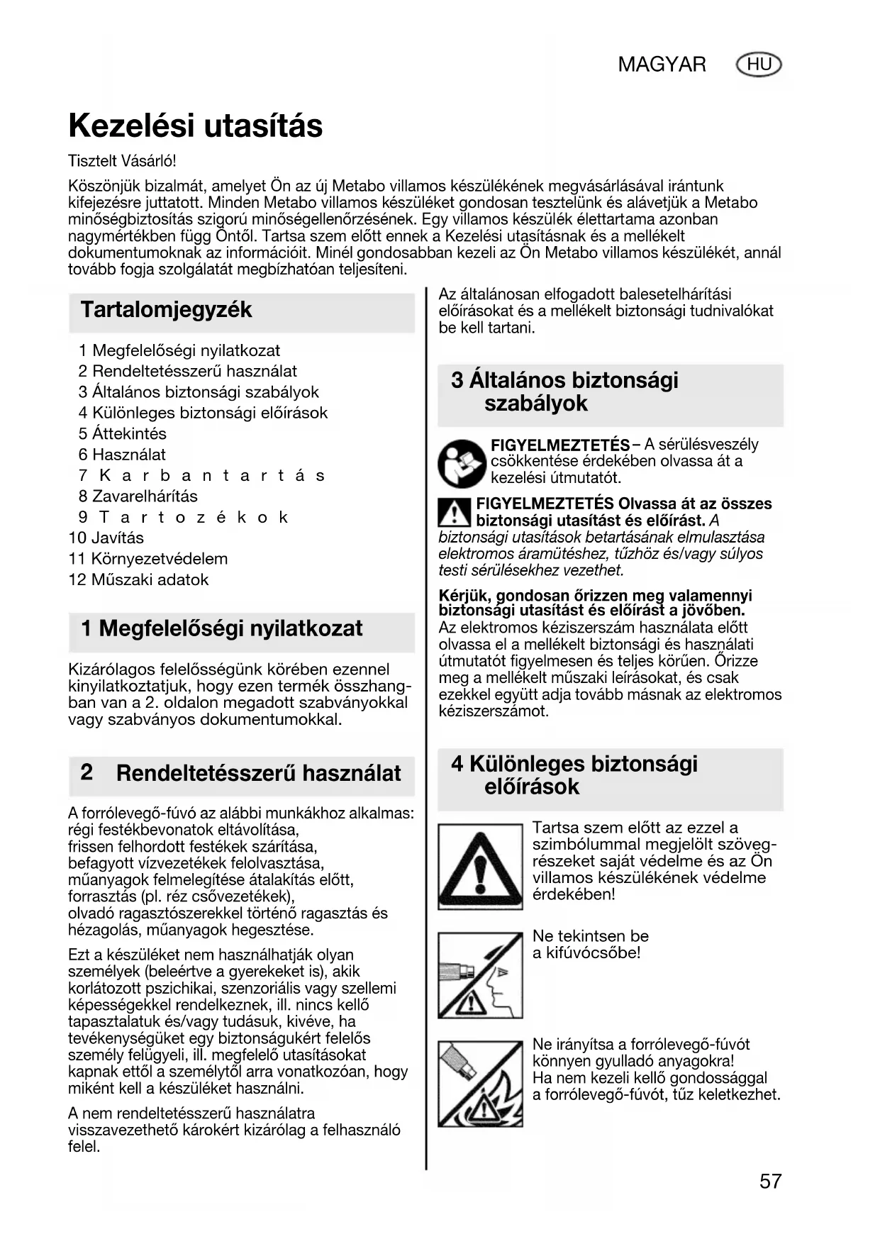 biztonsági utasítások betartásának elmulasztása elektromos áramütéshez, tűzhöz és/vagy súlyos testi sérülésekhez vezethet. Kérjük, gondosan őrizzen meg valamennyi biztonsági utasítást és előírást a jövőben. Az elektromos kéziszerszám használata előtt olvassa el a mellékelt biztonsági és használati útmutatót figyelmesen és teljes körűen. Őrizze meg a mellékelt műszaki leírásokat, és csak ezekkel együtt adja tovább másnak az elektromos kéziszerszámot. Tartsa szem előtt az ezzel a szimbólummal megjelölt szöveg- részeket saját védelme és az Ön villamos készülékének védelme érdekében! Ne tekintsen be a kifúvócsőbe! Ne irányítsa a forrólevegő-fúvót könnyen gyulladó anyagokra! Ha nem kezeli kellő gondossággal a forrólevegő-fúvót, tűz keletkezhet. Kezelési utasítás Tisztelt Vásárló! Köszönjük bizalmát, amelyet Ön az új Metabo villamos készülékének megvásárlásával irántunk kifejezésre juttatott. Minden Metabo villamos készüléket gondosan tesztelünk és alávetjük a Metabo minőségbiztosítás szigorú minőségellenőrzésének. Egy villamos készülék élettartama azonban nagymértékben függ Öntől. Tartsa szem előtt ennek a Kezelési utasításnak és a mellékelt dokumentumoknak az információit. Minél gondosabban kezeli az Ön Metabo villamos készülékét, annál tovább fogja szolgálatát megbízhatóan teljesíteni. Tartalomjegyzék 1 Megfelelőségi nyilatkozat