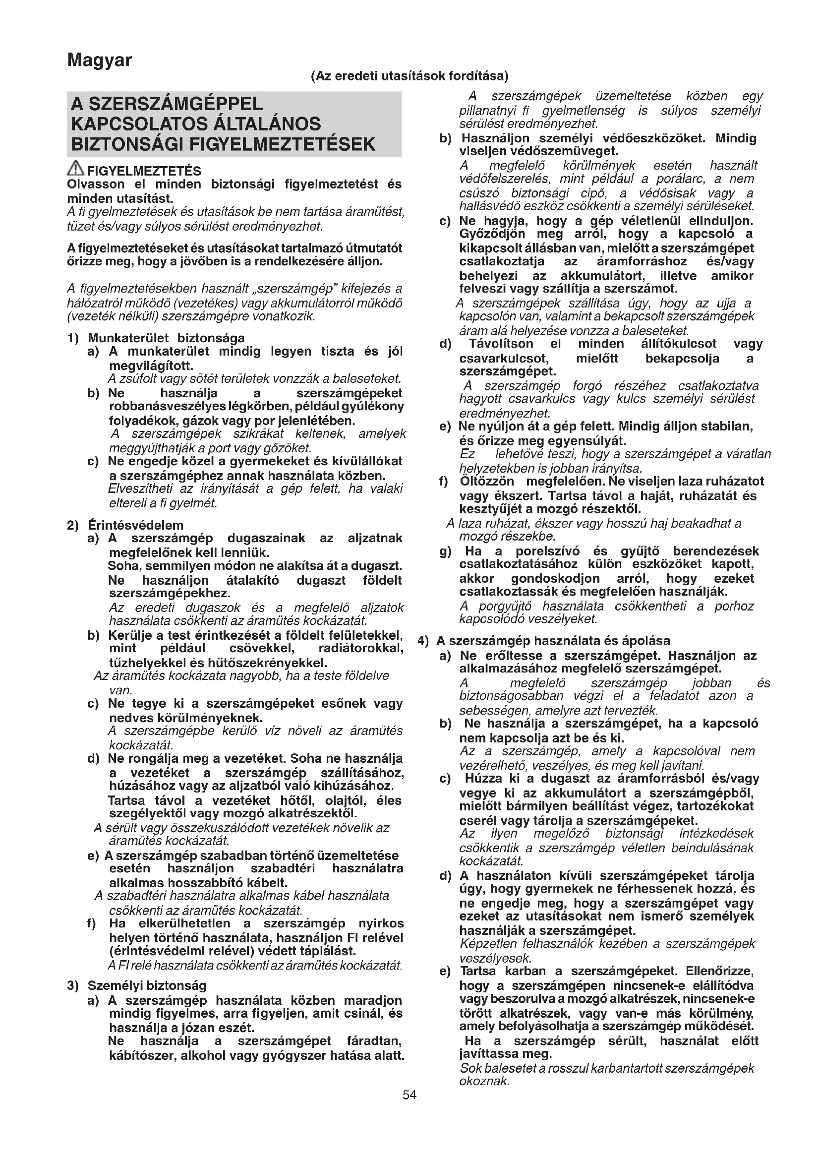 FIGYELMEZTETÉS Olvasson el minden biztonsági fi gyelmeztetést és minden utasítást. A fi gyelmeztetések és utasítások be nem tartása áramütést, tüzet és/vagy súlyos sérülést eredményezhet. A fi gyelmeztetéseket és utasításokat tartalmazó útmutatót őrizze meg, hogy a jövőben is a rendelkezésére álljon. A fi gyelmeztetésekben használt „szerszámgép” kifejezés a hálózatról működő (vezetékes) vagy akkumulátorról működő (vezeték nélküli) szerszámgépre vonatkozik.