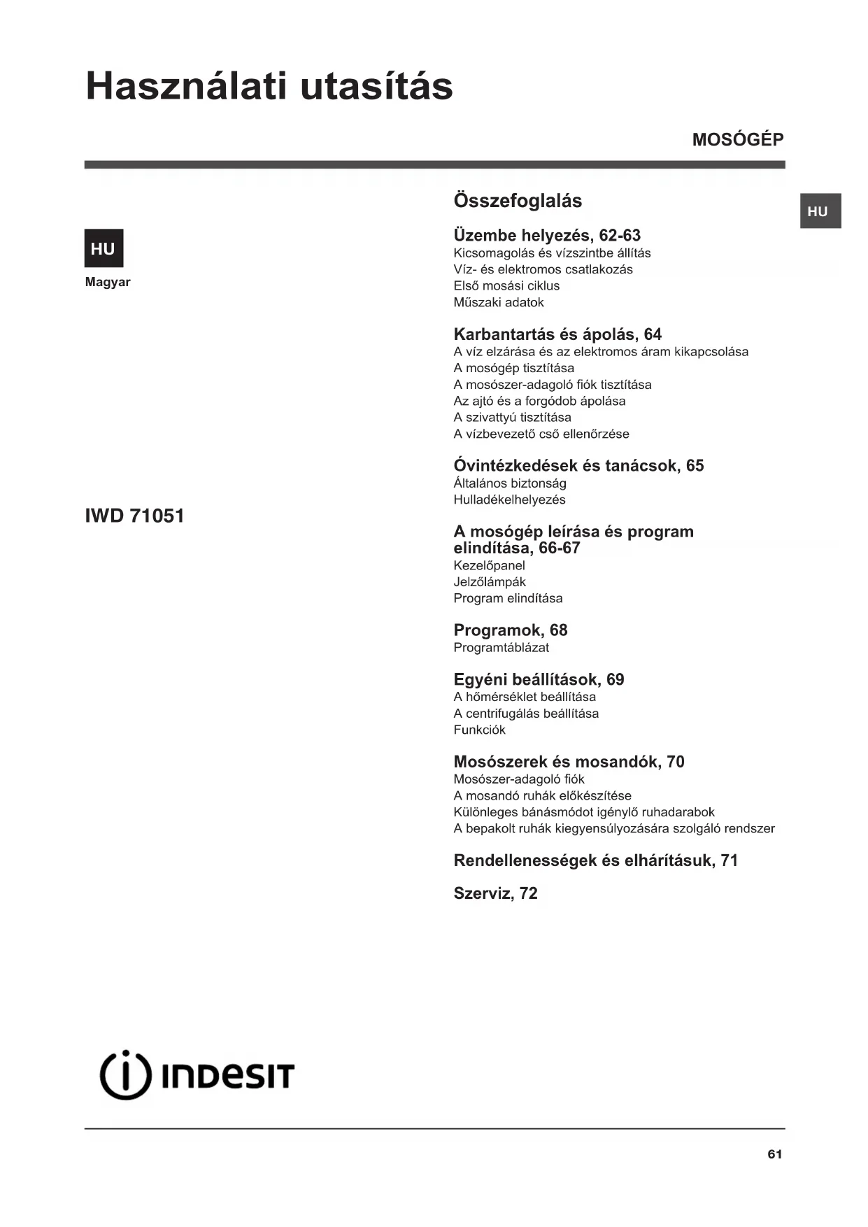 Magyar Összefoglalás Üzembe helyezés, 62-63 Kicsomagolás és vízszintbe állításVíz- és elektromos csatlakozásElső mosási ciklusMűszaki adatok Karbantartás és ápolás, 64 A víz elzárása és az elektromos áram kikapcsolásaA mosógép tisztításaA mosószer-adagoló ók tisztításaAz ajtó és a forgódob ápolásaA szivattyú tisztításaA vízbevezető cső ellenőrzése Óvintézkedések és tanácsok, 65 Általános biztonságHulladékelhelyezés A mosógép leírása és program elindítása, 66-67 KezelőpanelJelzőlámpákProgram elindítása Programok, 68 Programtáblázat Egyéni beállítások, 69 A hőmérséklet beállításaA centrifugálás beállításaFunkciók Mosószerek és mosandók, 70 Mosószer-adagoló ókA mosandó ruhák előkészítéseKülönleges bánásmódot igénylő ruhadarabokA bepakolt ruhák kiegyensúlyozására szolgáló rendszer Rendellenességek és elhárításuk, 71 Szerviz, 72