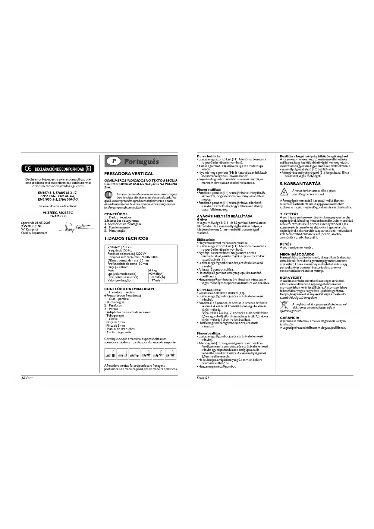 A motor karbantartása előtt a gépetfeszültségmentesíteni kell. A Ferm gépek hosszú idő keresztül működhetnekminimális karbantartással. A gép jó működéséhezszükség van a gép megfelelő gondozására és tisztítására.TISZTÍTÁSA gép házát rendszeresen tisztítsuk meg egy puha ruhasegítségével, lehetőleg minden használat után. A szellőzőrésekről távolítsuk el a port és a szennyeződést. Ha aszennyeződést nem lehet eltávolítani egy puha ruhasegítségével, akkor a ruhát szappanos vízzel nedvesítenikell. Nem szabad oldószereket (benzin, alkohol,ammóniás víz, stb.) használni.KENÉSA gép nem igényel kenést.MEGHIBÁSODÁSOKHa meghibásodás fordulna elő, pl. egy alkatrész kopásaután, kérjük, forduljon a garanciajegyen feltüntetettszervizhez. Ennek a kézikönyvnek a hátulján talál egyperspektivikus bontott részábrázolást, amely arendelhető alkatrészeket mutatja. KÖRNYEZETA szállítás során bekövetkező esetleges sérülésekelkerülése érdekében a gép meglehetősen erőscsomagolásban kerül leszállításra. A csomagoláshozfelhasznált anyagok nagy része újrafeldolgozható.Kérjük, hogy ezeket az anyagokat vigye a megfelelőszemétfeldolgozó telepekre.A meghibásodott vagy használhatatlanná váltelektromos berendezéseket adja leújrafeldolgozásra.GARANCIAA garanciális feltételek a mellékelt garancia kártyántalálhatók.A vágótalp elhasználódása nem tárgya a jótállásnak. Ferm 51 Declaramos bajo nuestra sola responsabilidad queeste producto está en conformidad con las normaso documentos normalizados siguientesEN60745-1, EN60745-2-17, EN55014-1, EN55014-2,EN61000-3-2, EN61000-3-3de acuerdo con las directivas:98/37EEC, 73/23EEC89/336/EECa partir de 01-05-2005ZWOLLE NLW. KamphofQuality department FRESADORA VERTICAL OS NÚMEROS INDICADOS NO TEXTO A SEGUIRCORRESPONDEM ÀS ILUSTRAÇÕES NA PÁGINA2 - 6.Atenção! Leia sempre cuidadosamente as instruçõespara produtos eléctricos antes da sua utilização. Vaiajudá-lo a compreender o produto mais facilmente e a evitarriscos desnecessários. Guarde este manual de instruções numlocal seguro para futuras utilizações.CONTEÚDOS1. Dados técnicos2. Instruções de segurança3. Acessórios de montagem4. Funcionamento5. Manutenção