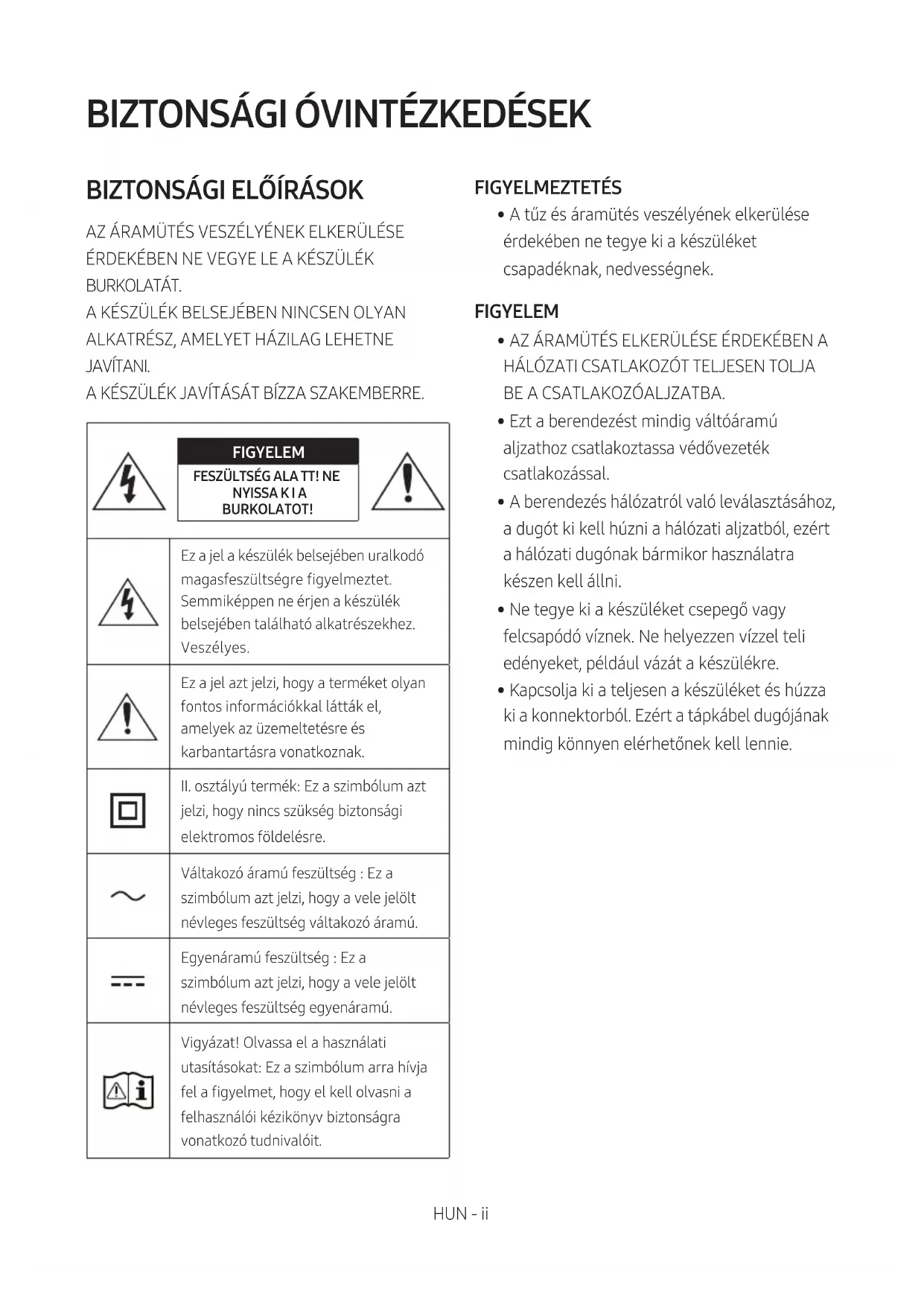 - Kapcsolja ki a teljesen a készüléket és húzza ki a konnektorból. Ezért a tápkábel dugójának mindig könnyen elérhetőnek kell lennie.HUN - iii BIZTONSÁGI