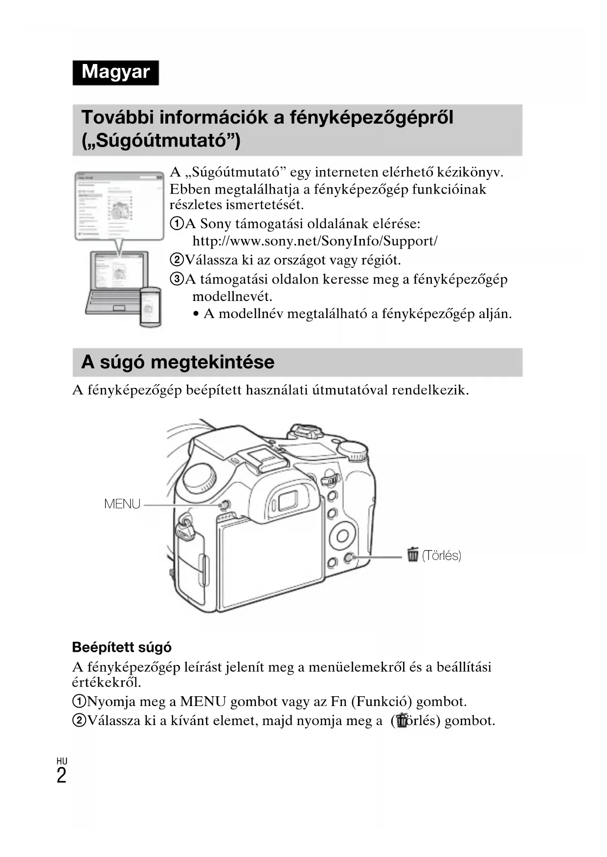 - A modellnév megtalálható a fényképezőgép alján. A súgó megtekintése (Törlés) MENUHU