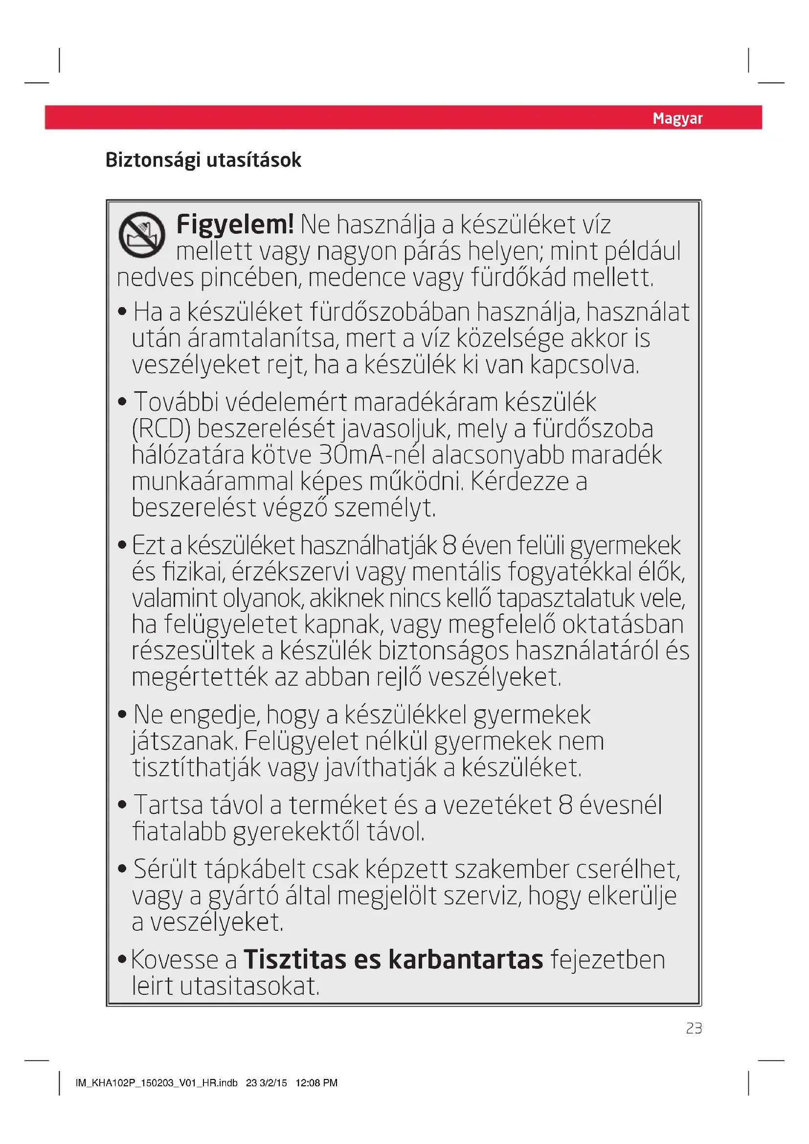 - Ha a keszüléket furdószobában használja, használat után áramtalanítsa, mert a viz kozelsége akkor is veszelyeket rejt, ha a keszülék ki van kapcsolva.