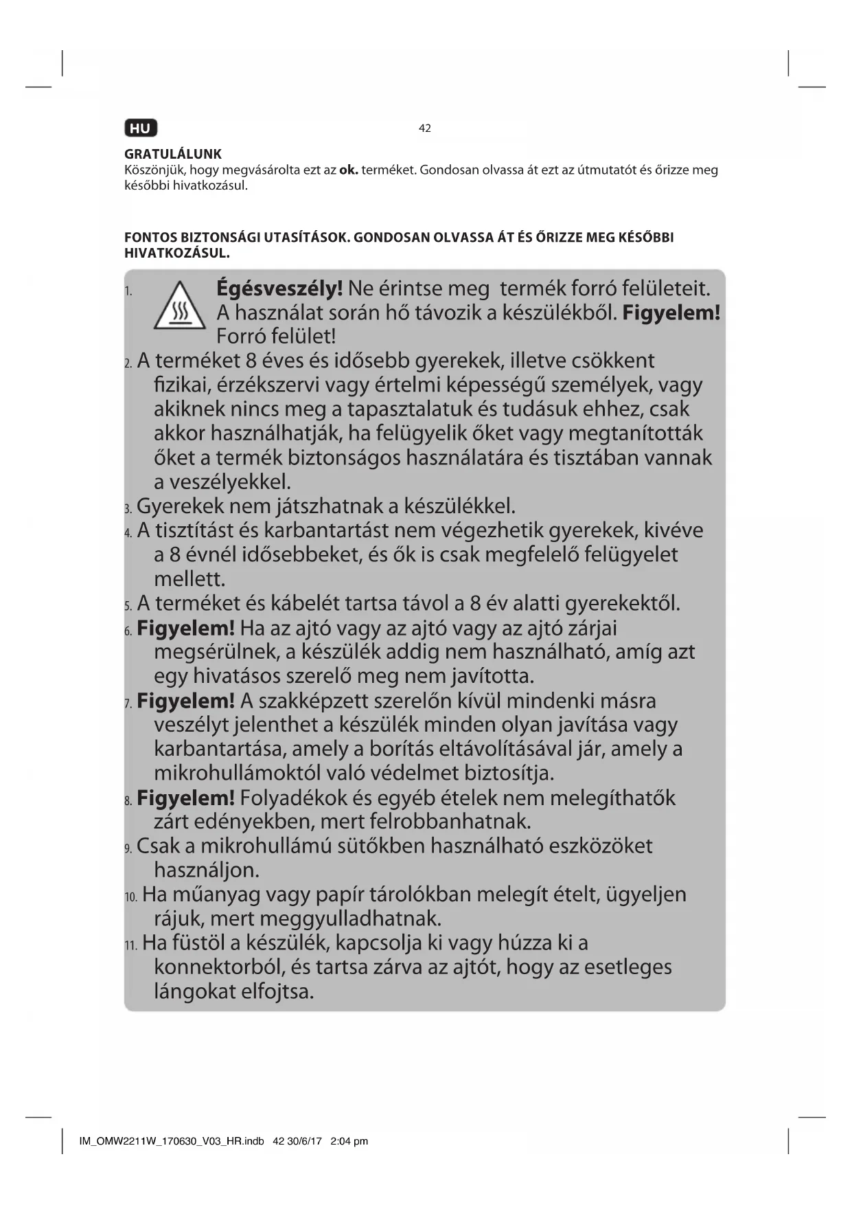 Ez a termék ételek kiolvasztására, újramelegítésére és főzésére alkalmas. Minden más használat a termék károsodását vagy sérüléseket okozhat. Az Imtron GmbH nem vállal felelősséget a termék nem körültekintő, illetve helytelen használatából, valamint a gyártó által meghatározott rendeltetéstől eltérő használatból eredő, a készülékben vagy az Ön értékeiben bekövetkezett károkért, vagy személyi sérülésekért. IM_OMW2211W_170630_V03_HR.indb 45 30/6/17 2:04 pm46