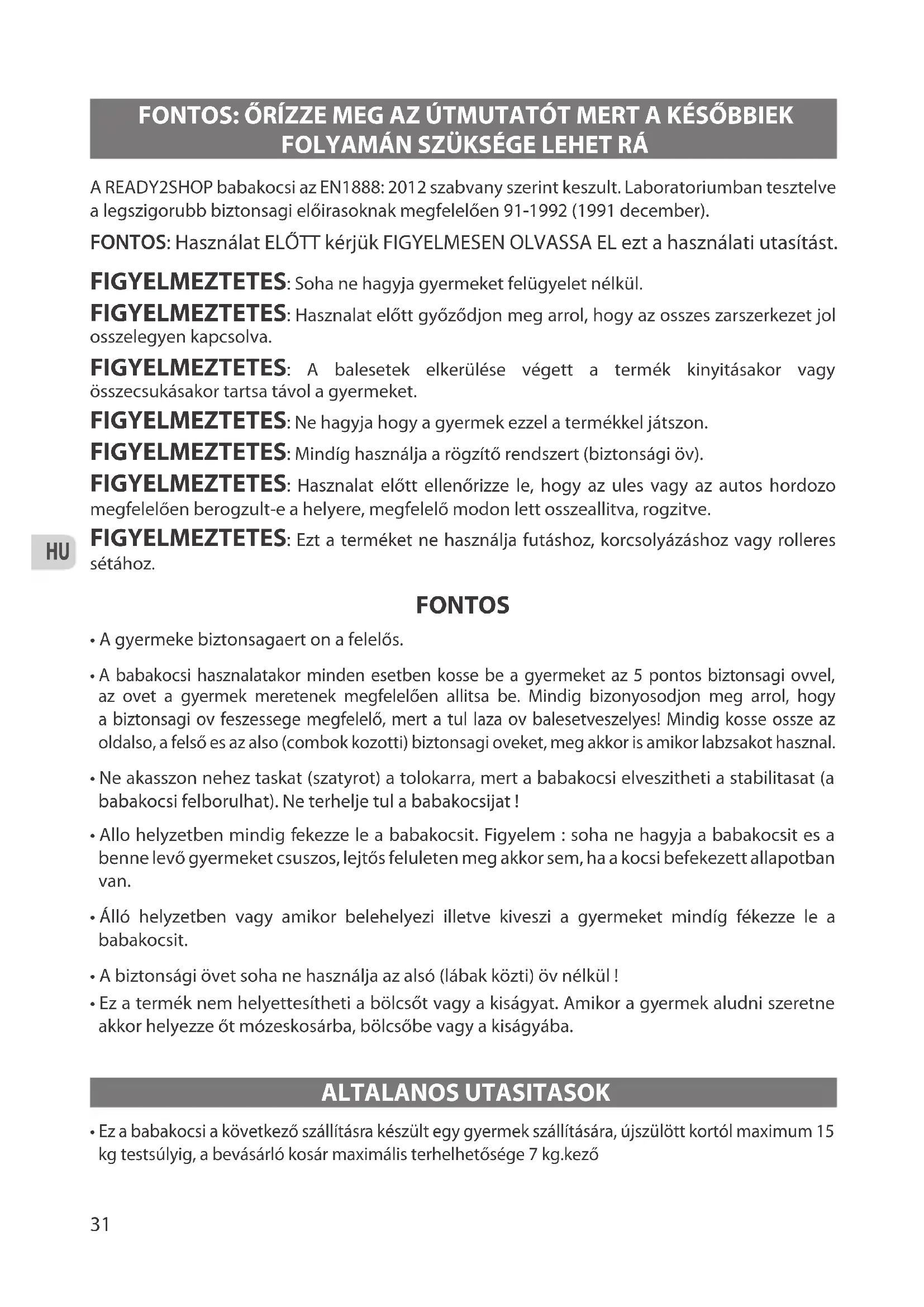 - Menet közben óvatosan közlekedjen, mert különféle akadályok lehetnek az úton (pl. magasabb útpadka stb.) melyek kárt tehetnek a babakocsiban. Figyeljen arra, hogy a gyermek kezei ne érjenek mozgó alkatrészekhez ! A READY2SHOP babakocsi az EN1888: 2012 szabvany szerint keszult. Laboratoriumban tesztelve a legszigorubb biztonsagi előirasoknak megfelelően 91-1992 (1991 december). FONTOS: Használat ELŐTT kérjük FIGYELMESEN OLVASSA EL ezt a használati utasítást. FIGYELMEZTETES: Soha ne hagyja gyermeket felügyelet nélkül. FIGYELMEZTETES: Hasznalat előtt győződjon meg arrol, hogy az osszes zarszerkezet jol osszelegyen kapcsolva. FIGYELMEZTETES: A balesetek elkerülése végett a termék kinyitásakor vagy összecsukásakor tartsa távol a gyermeket. FIGYELMEZTETES: Ne hagyja hogy a gyermek ezzel a termékkel játszon. FIGYELMEZTETES: Mindíg használja a rögzítő rendszert (biztonsági öv). FIGYELMEZTETES: Hasznalat előtt ellenőrizze le, hogy az ules vagy az autos hordozo megfelelően berogzult-e a helyere, megfelelő modon lett osszeallitva, rogzitve. FIGYELMEZTETES: Ezt a terméket ne használja futáshoz, korcsolyázáshoz vagy rolleres sétához. FONTOS