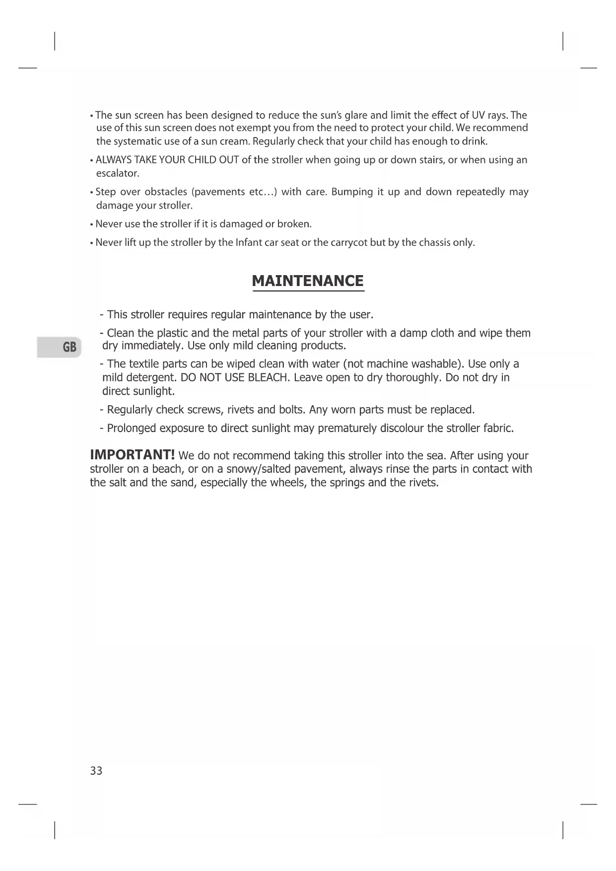 - Soha ne emelje meg a babakocsit a hordozónál vagy a mózeskosárnál fogva, kizárólag a vázszerkezetnél. KARBANTARTÁS - A babakocsi rendszeres karbantartást igényel. - A babakocsi fémes részeit egy nedves ruhadarabbal tisztítsa, majd azonnal törölje szárazra. Ne használjon savó-maró anyagot. - A babakocsi textilből készült részeit vízzel tisztítsa (mosógépben nem mosható). Ne használjon agresszív mosószert ! NE HASZNÁLJON FEHÉRÍTŐSZERT. Árnyékban szárítsa. - A babakocsit száraz, hűvős, jól szellőző helyen tárolja. - Ellenőrízze rendszeresen a csavarokat, szegecseket és csapszegeket. Cserélje ki a rossz állapotban lévőket. - Ha hosszú időn keresztül napfény éri a babakocsit, a huzat elszineződhet. FIGYELEM! A babakocsi tengervízben való használata nem ajánlott. A tengerparton való használat után mossa le azokat a részeket amelyek érintkeztek a sós vízzel, illetve a homokkal ; különösen a kerekeket, a rugókat és a szegecseket (tél idején való sózás, homokszóráskor egyaránt).37