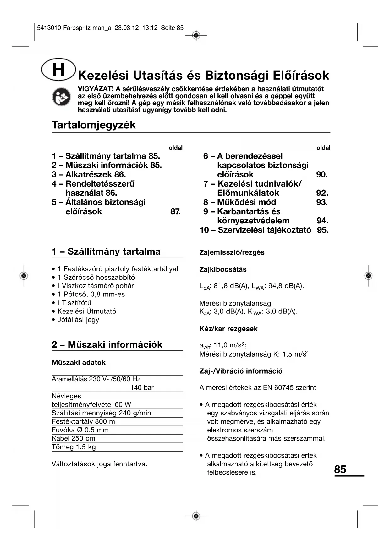FIGYELEM! Nem kerülhető el a berendezés okozta bizonyos zajterhelés. Ezért a nagyon zajos munkavégzést a megengedett és arra kijelölt időszakokban kell végezni. Tartsa magát adott esetben a nyugalmi időhöz, és a munkavégzés időtartamát szorítsa a legszükségesebbre!