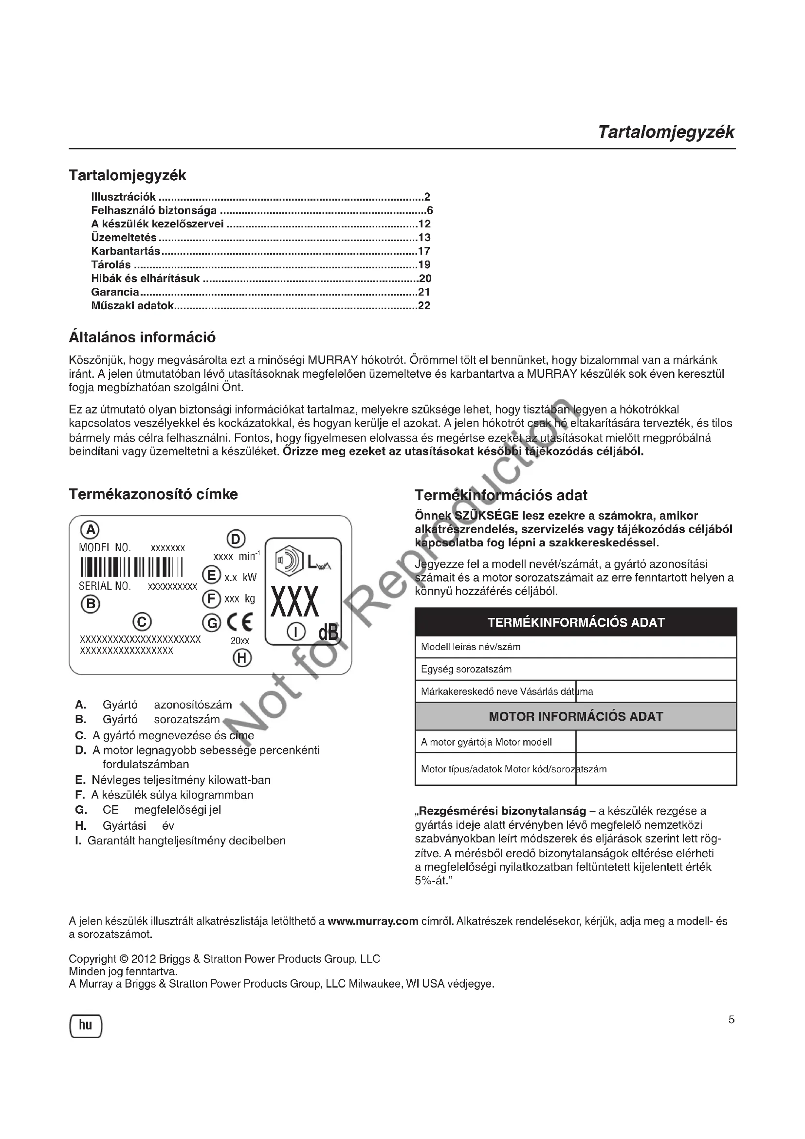- Műszaki adatok Általános információ Köszönjük, hogy megvásárolta ezt a minőségi MURRAY hókotrót. Örömmel tölt el bennünket, hogy bizalommal van a márkánk iránt. A jelen útmutatóban lévő utasításoknak megfelelően üzemeltetve és karbantartva a MURRAY készülék sok éven keresztül fogja megbízhatóan szolgálni Önt. Ez az útmutató olyan biztonsági információkat tartalmaz, melyekre szüksége lehet, hogy tisztában legyen a hókotrókkal kapcsolatos veszélyekkel és kockázatokkal, és hogyan kerülje el azokat. A jelen hókotrót csak hó eltakarítására tervezték, és tilos bármely más célra felhasználni. Fontos, hogy figyelmesen elolvassa és megértse ezeket az utasításokat mielőtt megpróbálná beindítani vagy üzemeltetni a készüléket. Őrizze meg ezeket az utasításokat későbbi tájékozódás céljából. Termékinformációs adat Önnek SZÜKSÉGE lesz ezekre a számokra, amikor alkatrészrendelés, szervizelés vagy tájékozódás céljából kapcsolatba fog lépni a szakkereskedéssel.Jegyezze fel a modell nevét/számát, a gyártó azonosítási számait és a motor sorozatszámait az erre fenntartott helyen a könnyű hozzáférés céljából.TERMÉKINFORMÁCIÓS ADATModell leírás név/számEgység sorozatszámMárkakereskedő neve Vásárlás dátumaMOTOR INFORMÁCIÓS ADATA motor gyártója Motor modellMotor típus/adatok Motor kód/sorozatszám p. 22