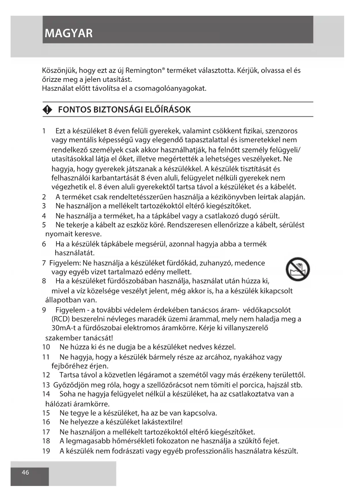 8 Ha a keszüléket furdószobában használja, hasznalat után húzza ki, mivel a viz kozelsége veszelyt jelent, meg akkor is, ha a keszülék kikapcsolt állapotban van.
