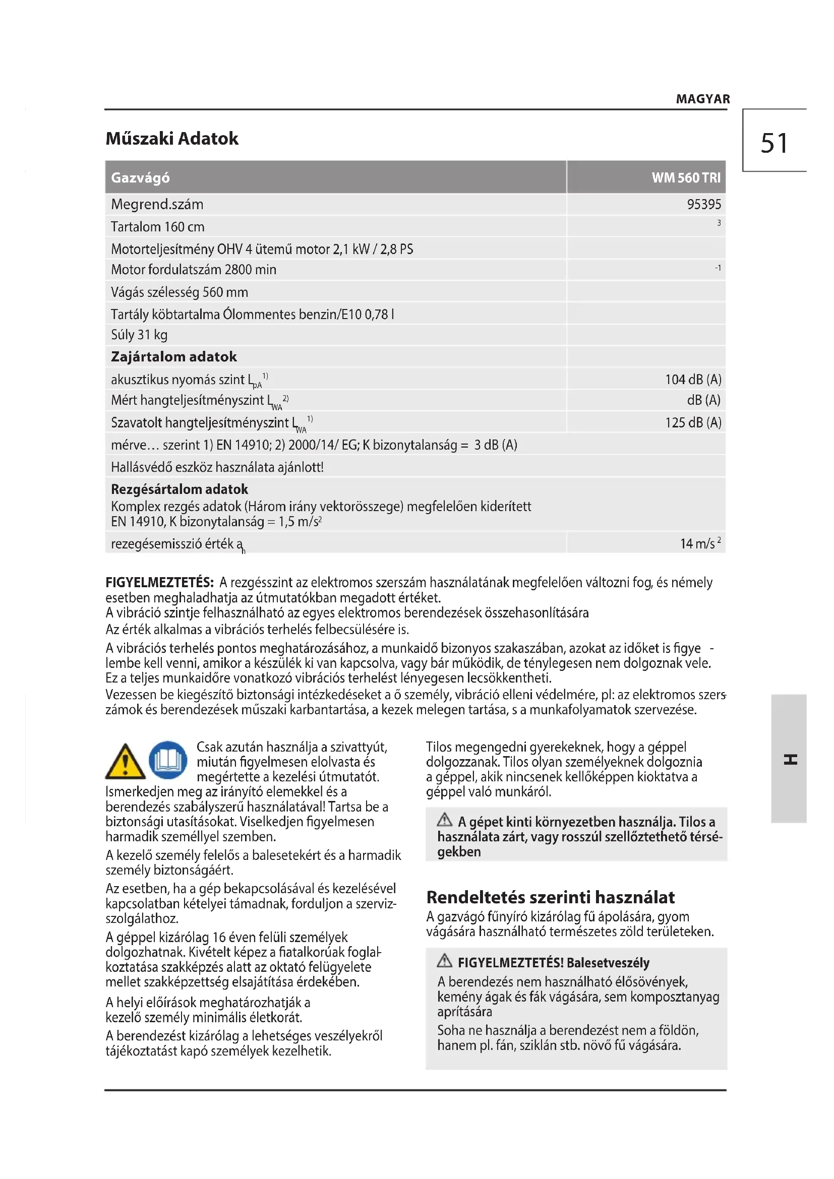 koztatása szakképzés alatt az oktató felügyelete melletszakképzettség elsajátítása érdekében. A helyi előírások meghatározhatják a kezelő személy minimális életkorát. A berendezést kizárólag a lehetséges veszélyekről tájékoztatást kapó személyek kezelhetik. Tilos megengedni gyerekeknek, hogy a géppel dolgozzanak. Tilos olyan személyeknek dolgoznia a géppel, akik nincsenek kellőképpen kioktatva a géppel való munkáról. A gépet kinti környezetben használja. Tilos a használata zárt, vagy rosszúl szellőztethető térsé- gekben Rendeltetés szerinti használat A gazvágó fűnyíró kizárólag fű ápolására, gyom vágására használható természetes zöld területeken. FIGYELMEZTETÉS! Balesetveszély A berendezés nem használható élősövények, kemény ágak és fák vágására, sem komposztanyag aprítására Soha ne használja a berendezést nem a földön, hanem pl. fán, sziklán stb. növő fű vágására. MAGYAR52