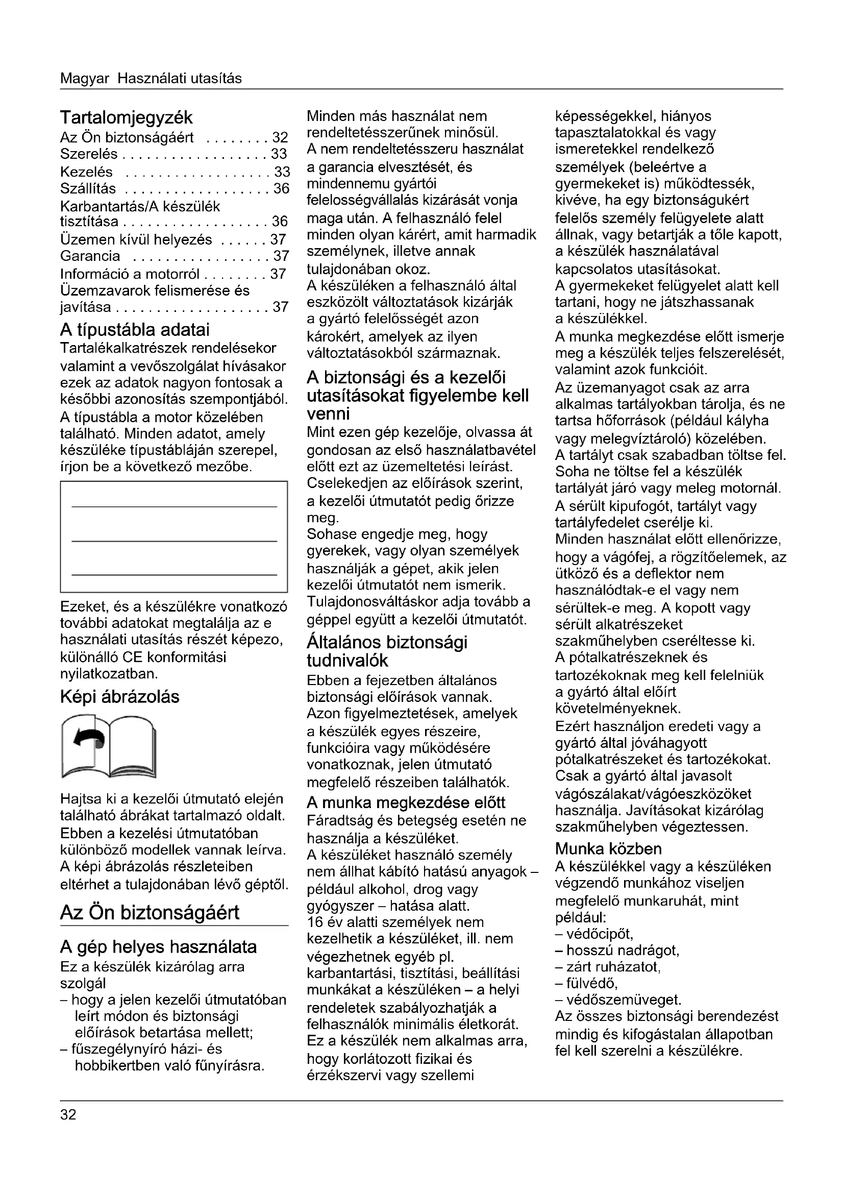 - Üzemzavarok felismerése és javítása A típustábla adatai Tartalékalkatrészek rendelésekor valamint a vevőszolgálat hívásakor ezek az adatok nagyon fontosak a későbbi azonosítás szempontjából. A típustábla a motor közelében található. Minden adatot, amely készüléke típustábláján szerepel, írjon be a következő mezőbe. Ezeket, és a készülékre vonatkozó további adatokat megtalálja az e használati utasítás részét képezo, különálló CE konformitási nyilatkozatban. Képi ábrázolás Hajtsa ki a kezelői útmutató elején található ábrákat tartalmazó oldalt. Ebben a kezelési útmutatóban különböző modellek vannak leírva. A képi ábrázolás részleteiben eltérhet a tulajdonában lévő géptől. Az Ön biztonságáért A gép helyes használata Ez a készülék kizárólag arra szolgál – hogy a jelen kezelői útmutatóban leírt módon és biztonsági előírások betartása mellett; – fűszegélynyíró házi- és hobbikertben való fűnyírásra. Minden más használat nem rendeltetésszerűnek minősül. A nem rendeltetésszeru használat a garancia elvesztését, és mindennemu gyártói felelosségvállalás kizárását vonja maga után. A felhasználó felel minden olyan kárért, amit harmadik személynek, illetve annak tulajdonában okoz. A készüléken a felhasználó által eszközölt változtatások kizárják a gyártó felelősségét azon károkért, amelyek az ilyen változtatásokból származnak. A biztonsági és a kezelői utasításokat figyelembe kell venni Mint ezen gép kezelője, olvassa át gondosan az első használatbavétel előtt ezt az üzemeltetési leírást. Cselekedjen az előírások szerint, a kezelői útmutatót pedig őrizze meg. Sohase engedje meg, hogy gyerekek, vagy olyan személyek használják a gépet, akik jelen kezelői útmutatót nem ismerik. Tulajdonosváltáskor adja tovább a géppel együtt a kezelői útmutatót. Általános biztonsági tudnivalók Ebben a fejezetben általános biztonsági előírások vannak. Azon figyelmeztetések, amelyek a készülék egyes részeire, funkcióira vagy működésére vonatkoznak, jelen útmutató megfelelő részeiben találhatók. A munka megkezdése előtt Fáradtság és betegség esetén ne használja a készüléket. A készüléket használó személy nem állhat kábító hatású anyagok – például alkohol, drog vagy gyógyszer – hatása alatt. 16 év alatti személyek nem kezelhetik a készüléket, ill. nem végezhetnek egyéb pl. karbantartási, tisztítási, beállítási munkákat a készüléken – a helyi rendeletek szabályozhatják a felhasználók minimális életkorát. Ez a készülék nem alkalmas arra, hogy korlátozott fizikai és érzékszervi vagy szellemi képességekkel, hiányos tapasztalatokkal és vagy ismeretekkel rendelkező személyek (beleértve a gyermekeket is) működtessék, kivéve, ha egy biztonságukért felelős személy felügyelete alatt állnak, vagy betartják a tőle kapott, a készülék használatával kapcsolatos utasításokat. A gyermekeket felügyelet alatt kell tartani, hogy ne játszhassanak a készülékkel. A munka megkezdése előtt ismerje meg a készülék teljes felszerelését, valamint azok funkcióit. Az üzemanyagot csak az arra alkalmas tartályokban tárolja, és ne tartsa hőforrások (például kályha vagy melegvíztároló) közelében. A tartályt csak szabadban töltse fel. Soha ne töltse fel a készülék tartályát járó vagy meleg motornál. A sérült kipufogót, tartályt vagy tartályfedelet cserélje ki. Minden használat előtt ellenőrizze, hogy a vágófej, a rögzítőelemek, az ütköző és a deflektor nem használódtak-e el vagy nem sérültek-e meg. A kopott vagy sérült alkatrészeket szakműhelyben cseréltesse ki. A pótalkatrészeknek és tartozékoknak meg kell felelniük a gyártó által előírt követelményeknek. Ezért használjon eredeti vagy a gyártó által jóváhagyott pótalkatrészeket és tartozékokat. Csak a gyártó által javasolt vágószálakat/vágóeszközöket használja. Javításokat kizárólag szakműhelyben végeztessen. Munka közben A készülékkel vagy a készüléken végzendő munkához viseljen megfelelő munkaruhát, mint például: – védőcipőt, – hosszú nadrágot, – zárt ruházatot, – fülvédő, – védőszemüveget. Az összes biztonsági berendezést mindig és kifogástalan állapotban fel kell szerelni a készülékre.Használati utasítás Magyar A biztonsági berendezéseken semmilyen módosítást nem szabad végrehajtani.A készüléket csakis a gyártó által előírt és szállított műszaki állapotában szabad használni.Tilos megváltoztatni a gyári motorbeállításokat.Kerülje a nyílt láng használatát és ne dohányozzon. A gépen végzett minden munkánál A sérülések megelőzése végett minden, a gépen végzendő munka (pl. karbantartási és beállítási munkálatok) és a gép szállítása előtt (pl. felemelés vagy mozgatás)– kapcsolja ki a motort,– Várjon, amíg minden mozgó alkatrész teljesen leáll, és a motor lehűl.– A gyújtógyertya csatlakozóját a motornál vegye le, hogy a motor véletlen indítását megakadályozza.– A motor kézikönyvében található kiegészítő biztonsági utasításokat vegye figyelembe. A munka végeztével A gépet soha ne hagyja magára a motor leállítása nélkül. Biztonsági berendezések 1. ábraVeszélySoha ne használja a készüléket megrongálódott biztonsági berendezésekkel vagy biztonsági berendezések nélkül. Biztonsági kengyel (1) A biztonsági kengyel az Ön biztonságát szolgálja, szükség esetén a motort és a vágókészüléket azonnal leállítja. Nem szabad megkísérelni a funkciójának a kikapcsolását. Ütköző (5) Az ütköző véd a kiröpülő tárgyak által okozott sérülésektől. Deflektor (7) A deflektor véd a vágófej vagy a kiröpül