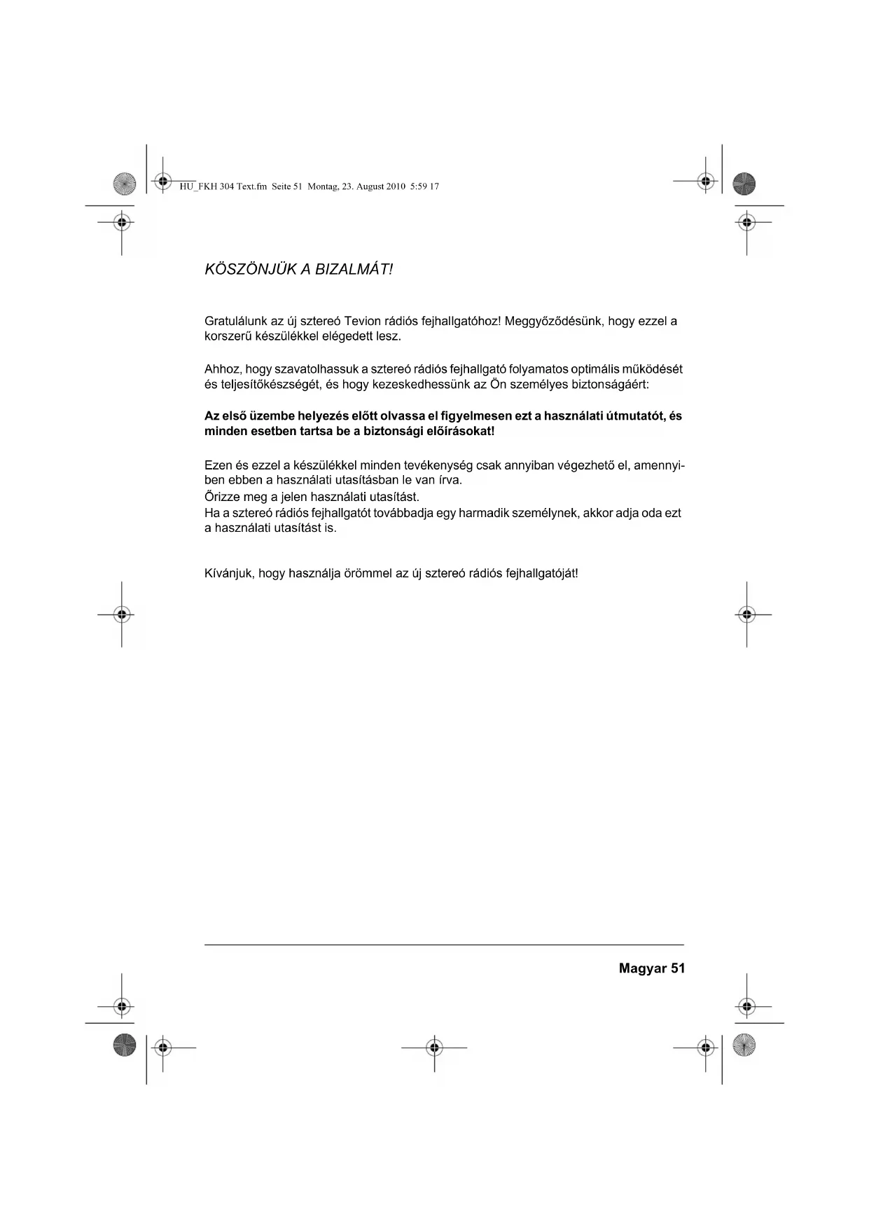 FKH 304 Hofer.book Seite 50 Montag, 9. August 2010 2:23 14Magyar 51 KÖSZÖNJÜK A BIZALMÁT! Gratulálunk az új sztereó Tevion rádiós fejhallgatóhoz! Meggyőződésünk, hogy ezzel a korszerű készülékkel elégedett lesz. Ahhoz, hogy szavatolhassuk a sztereó rádiós fejhallgató folyamatos optimális működését és teljesítőkészségét, és hogy kezeskedhessünk az Ön személyes biztonságáért: Az első üzembe helyezés előtt olvassa el figyelmesen ezt a használati útmutatót, és minden esetben tartsa be a biztonsági előírásokat! Ezen és ezzel a készülékkel minden tevékenység csak annyiban végezhető el, amennyi- ben ebben a használati utasításban le van írva. Őrizze meg a jelen használati utasítást. Ha a sztereó rádiós fejhallgatót továbbadja egy harmadik személynek, akkor adja oda ezt a használati utasítást is. Kívánjuk, hogy használja örömmel az új sztereó rádiós fejhallgatóját! HU_FKH 304 Text.fm Seite 51 Montag, 23. August 2010 5:59 1752 Magyar