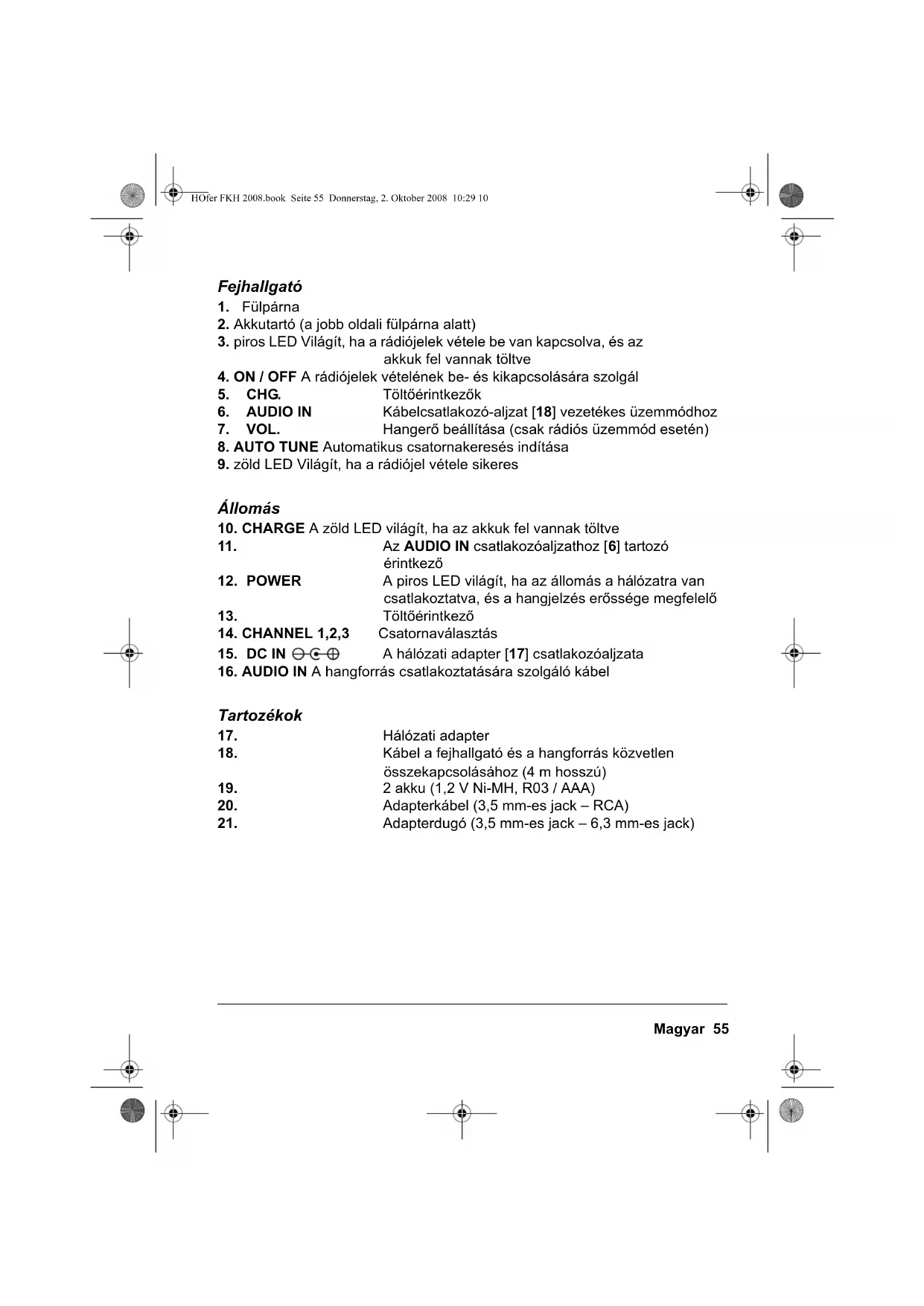 Audiocsatlakozó 3,5 mm-es, sztereó jack dugó Adapter [21]: 3,5 mm-es – 6,5 mm-es jack Adapter [20]: 3,5 mm-es jack – RCA Általános Méretek: Állomás: kb. 187 mm x 126 mm x 65 mm (H x Sz x M) Fejhallgató: kb. 195 mm x 92 mm x 214 mm (H x Sz x M) Tömeg: Állomás + fejhallgató: kb. 469 g Kézikönyv azonosítója: 41338 / pe / 2008 HOfer FKH 2008.book Seite 66 Donnerstag, 2. Oktober 2008 10:29 10HOfer FKH 2008.book Seite 67 Donnerstag, 2. Oktober 2008 10:29 10HOfer FKH 2008.book Seite 68 Donnerstag, 2. Oktober 2008 10:29 10