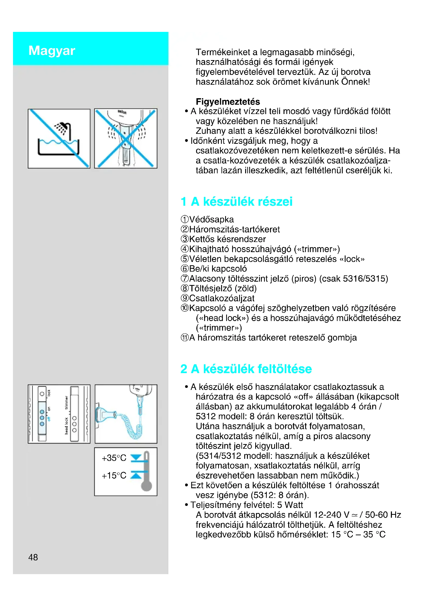 - Teljesítmény felvétel: 5 Watt A borotvát átkapcsolás nélkül 12-240 V2/ 50-60 Hz frekvenciájú hálózatról tölthetjük. A feltöltéshez legkedvezŒbb külsŒ hŒmérséklet: 15 °C – 35 °C +35°C +15°C off on lock trimmerhead lock Magyar 5465151_FI5312_16_MN Seite 48 Mittwoch, 4. Dezember 2002 2:29 1449 3 JelzŒfények