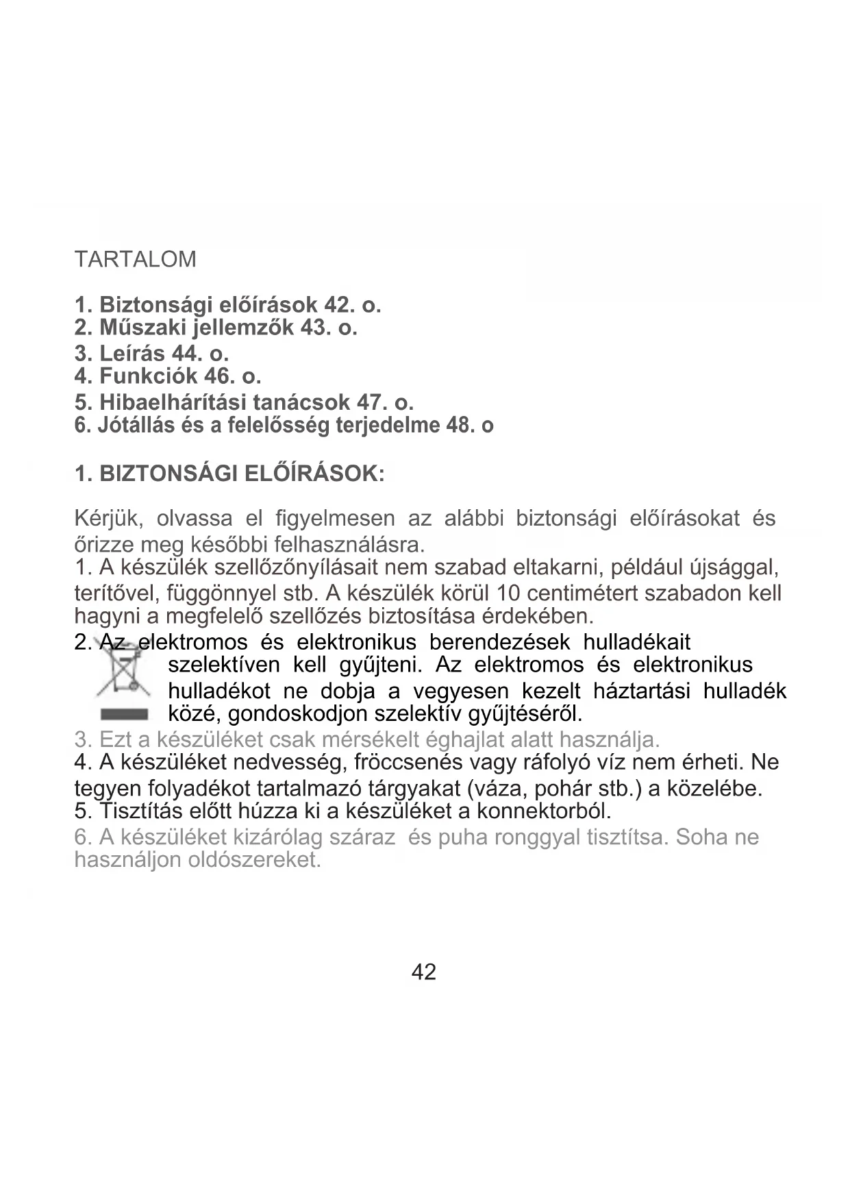 Erre a termékre a vásárlás időpontjától számított 24 hónap (a helyi jogszabályok szerint) jótállás vonatkozik, minden gyártási- vagy anyaghibából eredő meghibásodásra. Ez a jótállás nem terjed ki a rossz elhelyezésből, helytelen használatból, vagy a termék természetes elhasználódásából eredő károkra. A jótállás nem vonatkozik: - A helytelen használatból, balesetből, átalakításból vagy nem megfelelő áramerősségű illetve feszültségű elektromos csatlakozásból eredő károkra vagy meghibásodásokra. - Olyan termékekre, amelyeknek garancia címkéje vagy sorozatszáma sérült, megváltozott, eltávolították vagy rozsdás. - Az akkumulátor meghibásodására, ha a túl hosszú töltés, vagy az útmutatóban leírt biztonsági előírások gyelmen kívül hagyása miatt következett be - Esztétikai hibákra, ideértve a karcolást, ütésnyomokat vagy egyéb sérüléseket. - Engedéllyel nem rendelkező személy által végzett bármilyen beavatkozásból bekövetkezett károkra. - A természetes kopásból vagy a termék természetes elhasználódásából eredő meghibásodásokra - A rozsdás termékekre A javított vagy cserélt termékek tartalmazhatnak új és/vagy újracsomagolt összetevőket és tartozékokat49