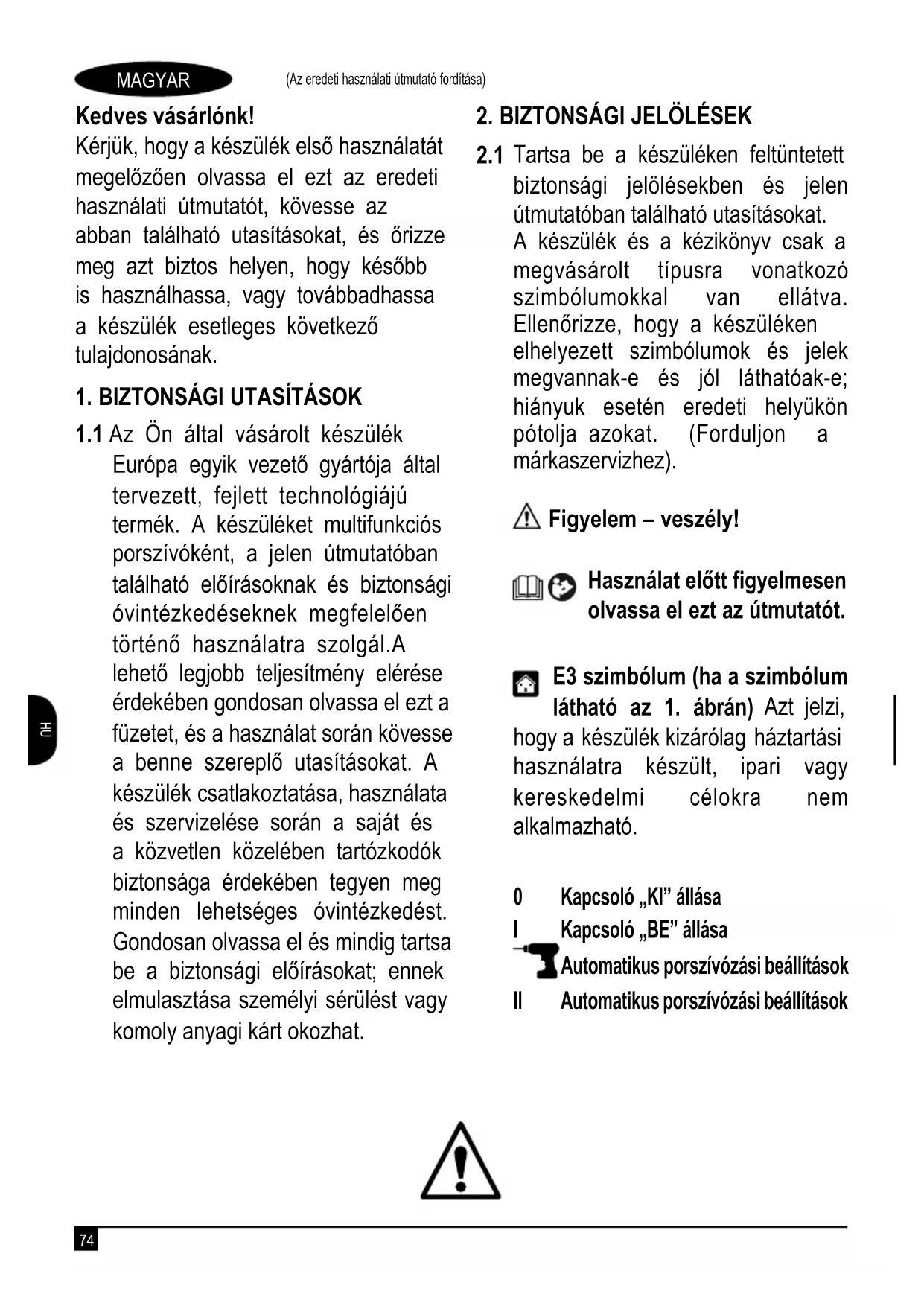 Tartsa be a készüléken feltüntetett biztonsági jelölésekben és jelen útmutatóban található utasításokat. A készülék és a kézikönyv csak a megvásárolt típusra vonatkozó szimbólumokkal van ellátva. Ellenőrizze, hogy a készüléken elhelyezett szimbólumok és jelek megvannak-e és jól láthatóak-e; hiányuk esetén eredeti helyükön pótolja azokat. (Forduljon a márkaszervizhez). Figyelem – veszély! Használat előtt figyelmesen olvassa el ezt az útmutatót. E3 szimbólum (ha a szimbólum látható az 1. ábrán) Azt jelzi, hogy a készülék kizárólag háztartási használatra készült, ipari vagy kereskedelmi célokra nem alkalmazható. 0 Kapcsoló „KI” állása I Kapcsoló „BE” állása Automatikus porszívózási beállítások II Automatikus porszívózási beállítások75 MAGYAR (Az eredeti használati útmutató fordítása)