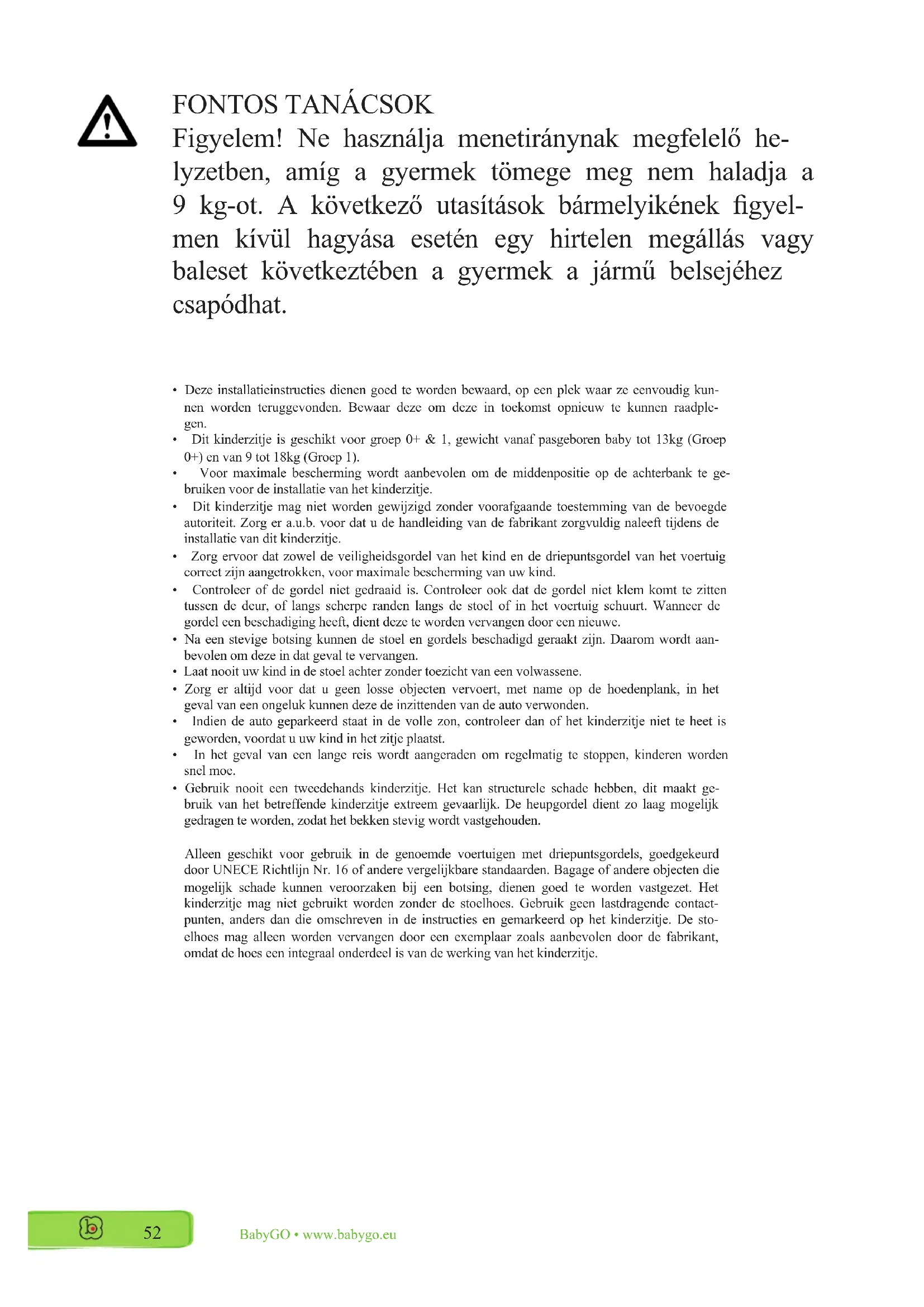 Figyelem! Ne használja menetiránynak megfelelo helyzetben,(amig a gyermek tomege meg nem haladja a 9 kg-ot.A kovetkez' utasítások barmelyikének figyelen kivül hagyasa eseten egy hirtelen megallas vagy baleset kovetkeztében a gyermek a jarmu besejéhecz csapódhat.