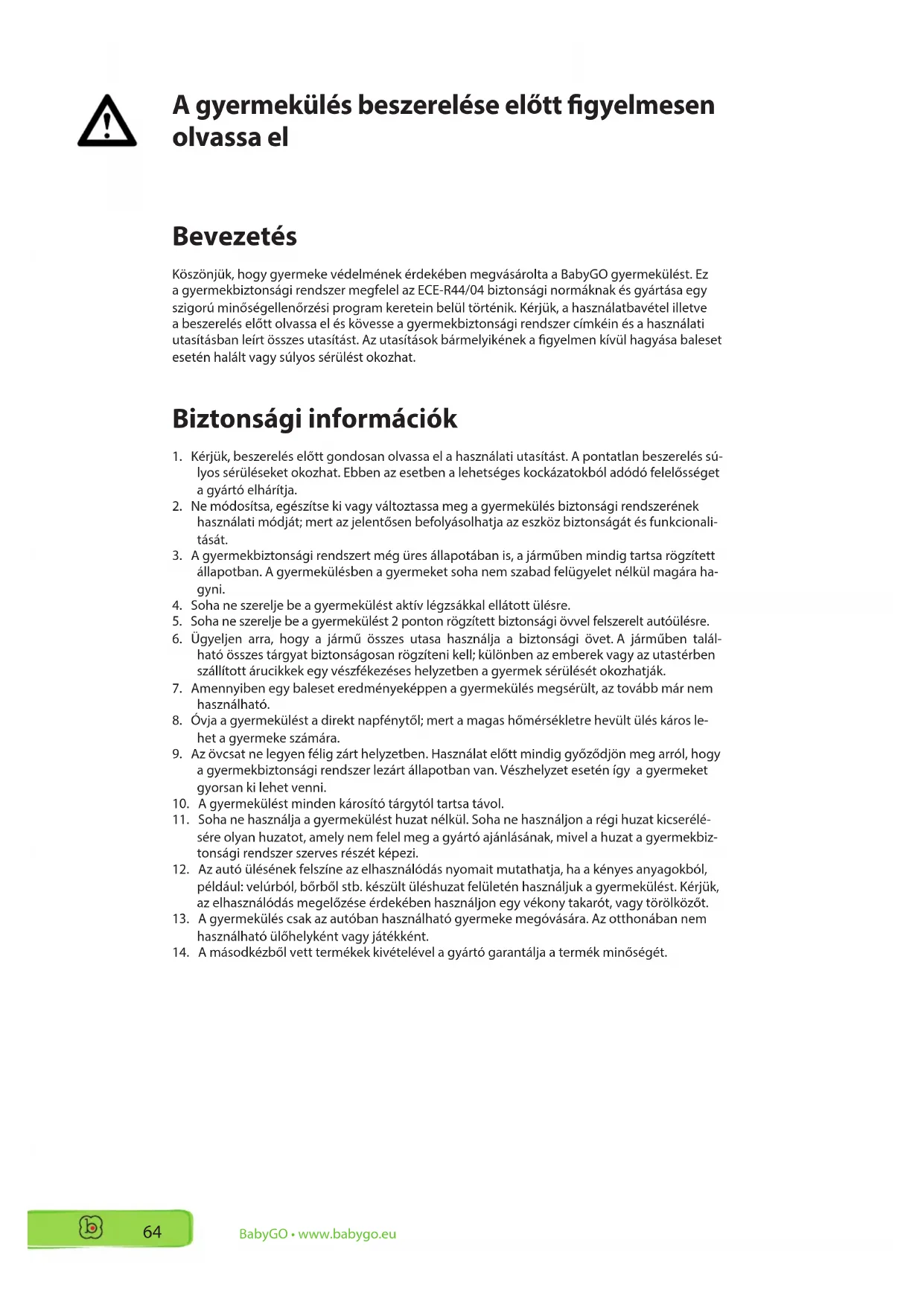 BabyGO • www.babygo.eu Bevezetés Köszönjük, hogy gyermeke védelmének érdekében megvásárolta a BabyGO gyermekülést. Ez a gyermekbiztonsági rendszer megfelel az ECE-R44/04 biztonsági normáknak és gyártása egy szigorú minőségellenőrzési program keretein belül történik. Kérjük, a használatbavétel illetve a beszerelés előtt olvassa el és kövesse a gyermekbiztonsági rendszer címkéin és a használati utasításban leírt összes utasítást. Az utasítások bármelyikének a gyelmen kívül hagyása baleset esetén halált vagy súlyos sérülést okozhat. Biztonsági információk