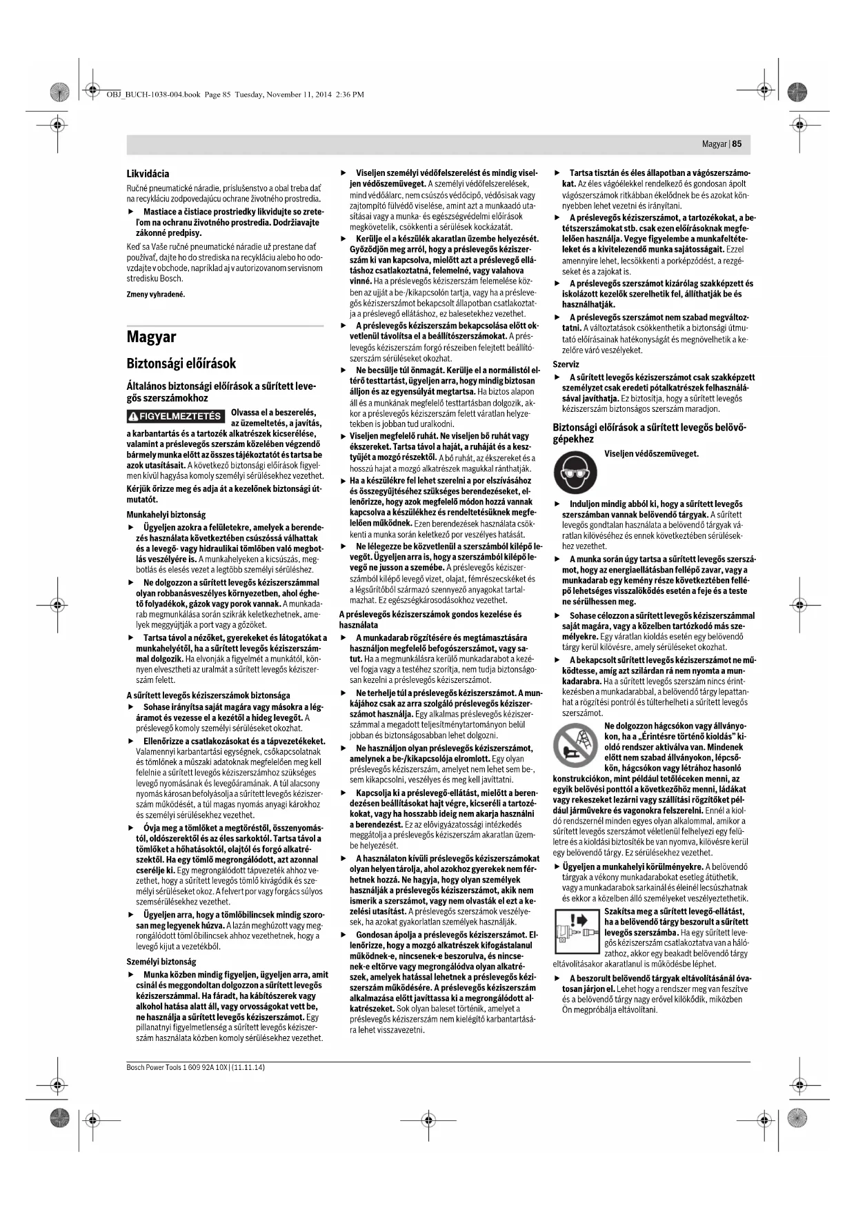 Ha a készülékre fel lehet szerelni a por elszívásához és összegyűjtéséhez szükséges berendezéseket, el- lenőrizze, hogy azok megfelelő módon hozzá vannak kapcsolva a készülékhez és rendeltetésüknek megfe- lelően működnek. Ezen berendezések használata csök- kenti a munka során keletkező por veszélyes hatását. Ne lélegezze be közvetlenül a szerszámból kilépő le- vegőt. Ügyeljen arra is, hogy a szerszámból kilépő le- vegő ne jusson a szemébe. A préslevegős kéziszer- számból kilépő levegő vizet, olajat, fémrészecskéket és a légsűrítőből származó szennyező anyagokat tartal- mazhat. Ez egészségkárosodásokhoz vezethet. A préslevegős kéziszerszámok gondos kezelése és használata A munkadarab rögzítésére és megtámasztására használjon megfelelő befogószerszámot, vagy sa- tut. Ha a megmunkálásra kerülő munkadarabot a kezé- vel fogja vagy a testéhez szorítja, nem tudja biztonságo- san kezelni a préslevegős kéziszerszámot. Ne terhelje túl a préslevegős kéziszerszámot. A mun- kájához csak az arra szolgáló préslevegős kéziszer- számot használja. Egy alkalmas préslevegős kéziszer- számmal a megadott teljesítménytartományon belül jobban és biztonságosabban lehet dolgozni. Ne használjon olyan préslevegős kéziszerszámot, amelynek a be-/kikapcsolója elromlott. Egy olyan préslevegős kéziszerszám, amelyet nem lehet sem be-, sem kikapcsolni, veszélyes és meg kell javíttatni. Kapcsolja ki a préslevegő-ellátást, mielőtt a beren- dezésen beállításokat hajt végre, kicseréli a tartozé- kokat, vagy ha hosszabb ideig nem akarja használni a berendezést. Ez az elővigyázatossági intézkedés meggátolja a préslevegős kéziszerszám akaratlan üzem- be helyezését. A használaton kívüli préslevegős kéziszerszámokat olyan helyen tárolja, ahol azokhoz gyerekek nem fér- hetnek hozzá. Ne hagyja, hogy olyan személyek használják a préslevegős kéziszerszámot, akik nem ismerik a szerszámot, vagy nem olvasták el ezt a ke- zelési utasítást. A préslevegős szerszámok veszélye- sek, ha azokat gyakorlatlan személyek használják. Gondosan ápolja a préslevegős kéziszerszámot. El- lenőrizze, hogy a mozgó alkatrészek kifogástalanul működnek-e, nincsenek-e beszorulva, és nincse- nek-e eltörve vagy megrongálódva olyan alkatré- szek, amelyek hatással lehetnek a préslevegős kézi- szerszám működésére. A préslevegős kéziszerszám alkalmazása előtt javíttassa ki a megrongálódott al- katrészeket. Sok olyan baleset történik, amelyet a préslevegős kéziszerszám nem kielégítő karbantartásá- ra lehet visszavezetni. Tartsa tisztán és éles állapotban a vágószerszámo- kat. Az éles vágóélekkel rendelkező és gondosan ápolt vágószerszámok ritkábban ékelődnek be és azokat kön- nyebben lehet vezetni és irányítani. A préslevegős kéziszerszámot, a tartozékokat, a be- tétszerszámokat stb. csak ezen előírásoknak megfe- lelően használja. Vegye figyelembe a munkafeltéte- leket és a kivitelezendő munka sajátosságait. Ezzel amennyire lehet, lecsökkenti a porképződést, a rezgé- seket és a zajokat is. A préslevegős szerszámot kizárólag szakképzett és iskolázott kezelők szerelhetik fel, állíthatják be és használhatják. A préslevegős szerszámot nem szabad megváltoz- tatni. A változtatások csökkenthetik a biztonsági útmu- tató előírásainak hatékonyságát és megnövelhetik a ke- zelőre váró veszélyeket. Szerviz A sűrített levegős kéziszerszámot csak szakképzett személyzet csak eredeti pótalkatrészek felhasználá- sával javíthatja. Ez biztosítja, hogy a sűrített levegős kéziszerszám biztonságos szerszám maradjon. Biztonsági előírások a sűrített levegős belövő- gépekhez Viseljen védőszemüveget. Induljon mindig abból ki, hogy a sűrített levegős szerszámban vannak belövendő tárgyak. A sűrített levegős gondtalan használata a belövendő tárgyak vá- ratlan kilövéséhez és ennek következtében sérülések- hez vezethet. A munka során úgy tartsa a sűrített levegős szerszá- mot, hogy az energiaellátásban fellépő zavar, vagy a munkadarab egy kemény része következtében fellé- pő lehetséges visszalökődés esetén a feje és a teste ne sérülhessen meg. Sohase célozzon a sűrített levegős kéziszerszámmal saját magára, vagy a közelben tartózkodó más sze- mélyekre. Egy váratlan kioldás esetén egy belövendő tárgy kerül kilövésre, amely sérüléseket okozhat. A bekapcsolt sűrített levegős kéziszerszámot ne mű- ködtesse, amíg azt szilárdan rá nem nyomta a mun- kadarabra. Ha a sűrített levegős szerszám nincs érint- kezésben a munkadarabbal, a belövendő tárgy lepattan- hat a rögzítési pontról és túlterhelheti a sűrített levegős szerszámot. Ne dolgozzon hágcsókon vagy állványo- kon, ha a „Érintésre történő kioldás” ki- oldó rendszer aktiválva van. Mindenek előtt nem szabad állványokon, lépcső- kön, hágcsókon vagy létrához hasonló konstrukciókon, mint például tetőléceken menni, az egyik belövési ponttól a következőhöz menni, ládákat vagy rekeszeket lezárni vagy szállítási rögzítőket pél- dául járművekre és vagonokra felszerelni. Ennél a kiol- dó rendszernél minden egyes olyan alkalommal, amikor a sűrített levegős szerszámot véletlenül felhelyezi egy felü- letre és a kioldási biztosíték be van nyomva, kilövésre kerül egy belövendő tárgy. Ez sérülésekhez vezethet. Ügyeljen a munkahelyi körülményekre. A belövendő tárgyak a vékony munkadarabokat esetleg átüthetik, vagy a munkadarabok sarkainál és éleinél lecsúszhatnak és ekkor a közelben álló személyeket veszélyeztethetik. Szakítsa meg a sűrített levegő-ellátást, ha a belövendő tárgy beszorult a sűrített levegős