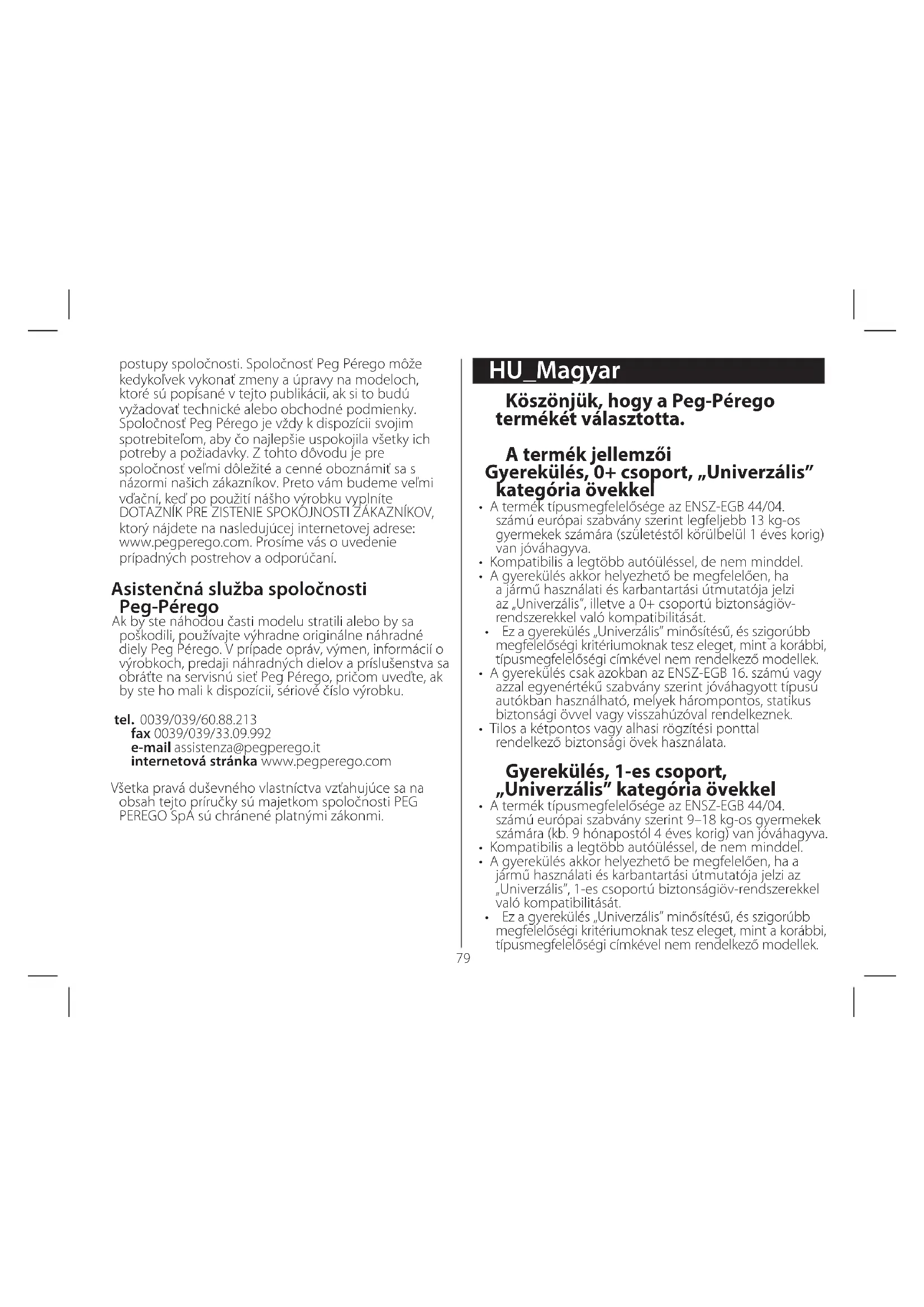 - Ez a gyerekülés „Univerzális” minősítésű, és szigorúbb megfelelőségi kritériumoknak tesz eleget, mint a korábbi, típusmegfelelőségi címkével nem rendelkező modellek. postupy spoločnosti. Spoločnosť Peg Pérego môže kedykoľvek vykonať zmeny a úpravy na modeloch, ktoré sú popísané v tejto publikácii, ak si to budú vyžadovať technické alebo obchodné podmienky. Spoločnosť Peg Pérego je vždy k dispozícii svojim spotrebiteľom, aby čo najlepšie uspokojila všetky ich potreby a požiadavky. Z tohto dôvodu je pre spoločnosť veľmi dôležité a cenné oboznámiť sa s názormi našich zákazníkov. Preto vám budeme veľmi vďační, keď po použití nášho výrobku vyplníte DOTAZNÍK PRE ZISTENIE SPOKOJNOSTI ZÁKAZNÍKOV, ktorý nájdete na nasledujúcej internetovej adrese: www.pegperego.com. Prosíme vás o uvedenie prípadných postrehov a odporúčaní. Asistenčná služba spoločnosti Peg-Pérego Ak by ste náhodou časti modelu stratili alebo by sa poškodili, používajte výhradne originálne náhradné diely Peg Pérego. V prípade opráv, výmen, informácií o výrobkoch, predaji náhradných dielov a príslušenstva sa obráťte na servisnú sieť Peg Pérego, pričom uveďte, ak by ste ho mali k dispozícii, sériové číslo výrobku. tel. 0039/039/60.88.213 fax 0039/039/33.09.992 e-mail assistenza@pegperego.it internetová stránka www.pegperego.com Všetka pravá duševného vlastníctva vzťahujúce sa na obsah tejto príručky sú majetkom spoločnosti PEG PEREGO SpA sú chránené platnými zákonmi. HU_Magyar80 FONTOS