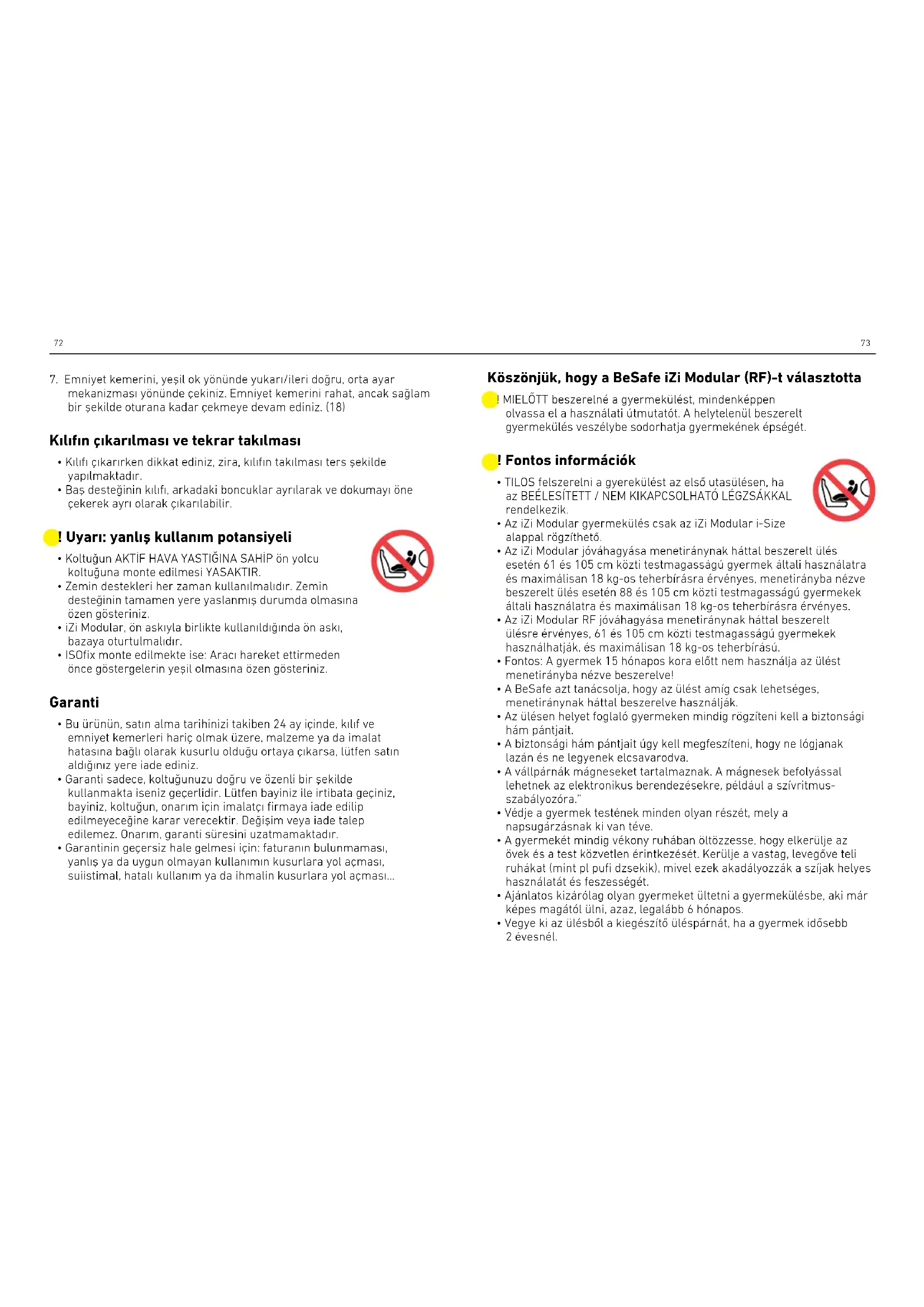 - Vegye ki az ülésből a kiegészítő üléspárnát, ha a gyermek idősebb 2 évesnél. Köszönjük, hogy a BeSafe iZi Modular (RF)-t választotta ! MIELŐTT beszerelné a gyermekülést, mindenképpen olvassa el a használati útmutatót. A helytelenül beszerelt gyermekülés veszélybe sodorhatja gyermekének épségét.74 75
