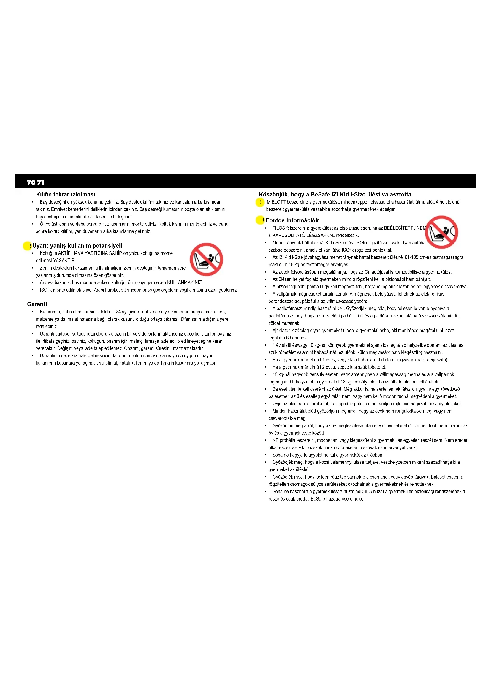 - Sohanehasználjaagyermeküléstahuzatnélkül.Ahuzatagyermekülésbiztonságirendszeréneka részeéscsakeredetiBeSafehuzatracserélhető. Köszönjük, hogy a BeSafe iZi Kid i-Size ülést választotta. ! MIELŐTTbeszerelnéagyermekülést,mindenképpenolvassaelahasználatiútmutatót.Ahelytelenül beszereltgyermekülésveszélybesodorhatjagyermekéneképségét.