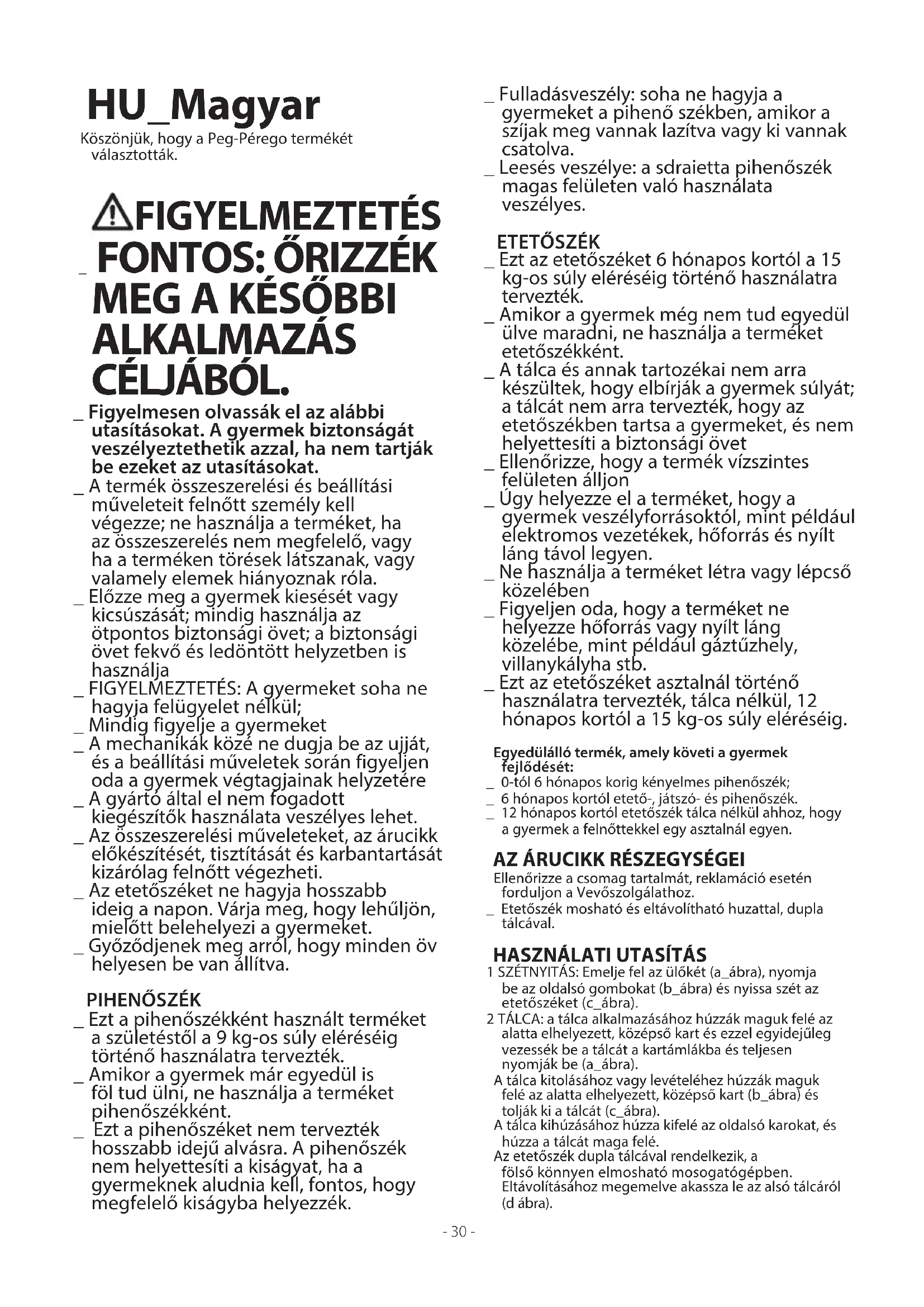 ALKALMAZÁS CÉLJÁBÓL. _ Figyelmesen olvassák el az alábbi utasításokat. A gyermek biztonságát veszélyeztethetik azzal, ha nem tartják be ezeket az utasításokat. _ A termék összeszerelési és beállítási műveleteit felnőtt személy kell végezze; ne használja a terméket, ha az összeszerelés nem megfelelő, vagy ha a terméken törések látszanak, vagy valamely elemek hiányoznak róla. _ Előzze meg a gyermek kiesését vagy kicsúszását; mindig használja az ötpontos biztonsági övet; a biztonsági övet fekvő és ledöntött helyzetben is használja _ FIGYELMEZTETÉS: A gyermeket soha ne hagyja felügyelet nélkül; _ Mindig figyelje a gyermeket _ A mechanikák közé ne dugja be az ujját, és a beállítási műveletek során figyeljen oda a gyermek végtagjainak helyzetére _ A gyártó által el nem fogadott kiegészítők használata veszélyes lehet. _ Az összeszerelési műveleteket, az árucikk előkészítését, tisztítását és karbantartását kizárólag felnőtt végezheti. _ Az etetőszéket ne hagyja hosszabb ideig a napon. Várja meg, hogy lehűljön, mielőtt belehelyezi a gyermeket. _ Győződjenek meg arról, hogy minden öv helyesen be van állítva.